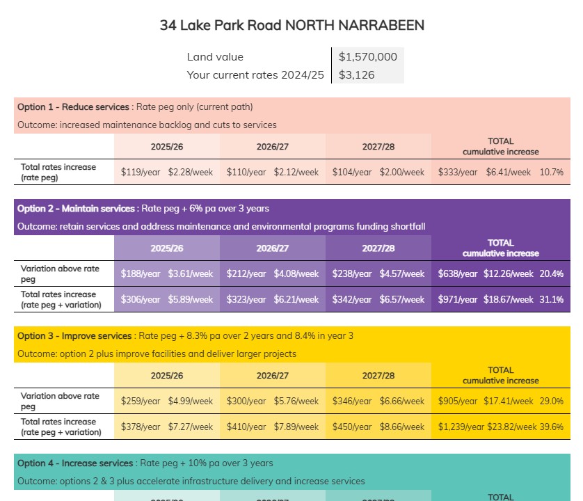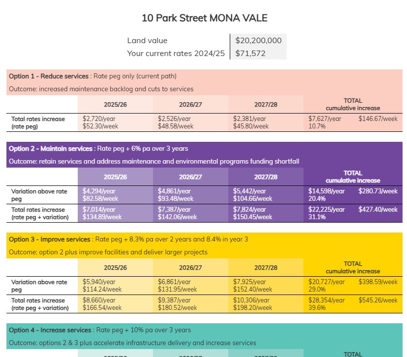 The council’s narrative has repeatedly stated ‘the proposal will equate to an increase for the average residential ratepayer of $2.70 per week next year, $3.12 per week in 2026/27 and $3.60 per week in 2027/28, on top of the usual rate peg increase’.