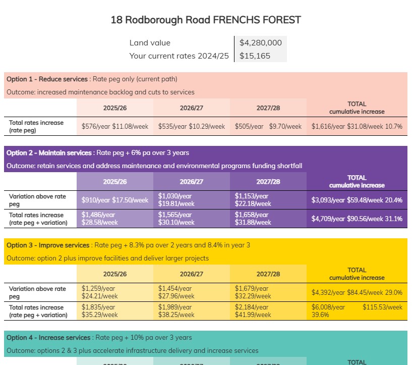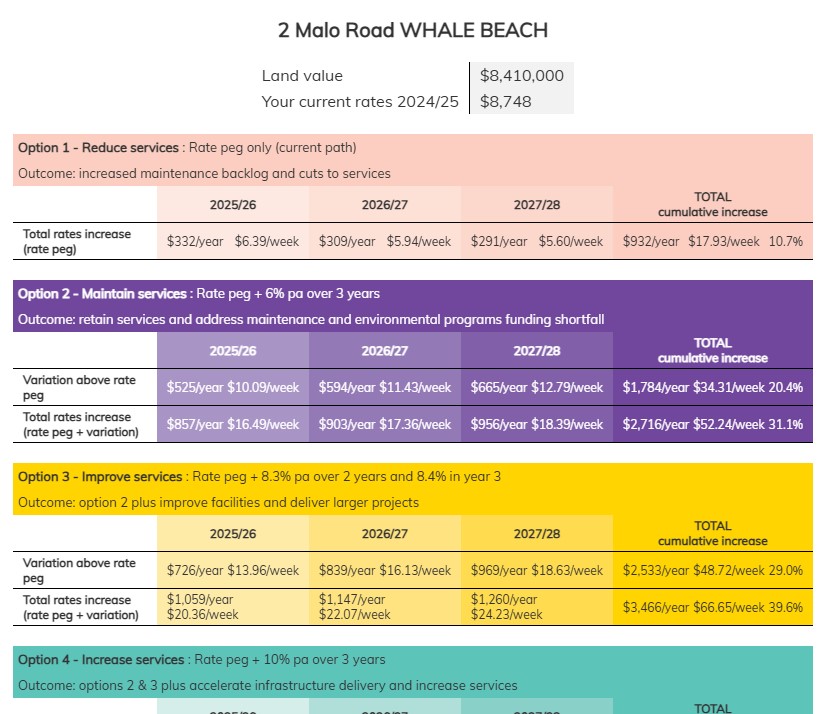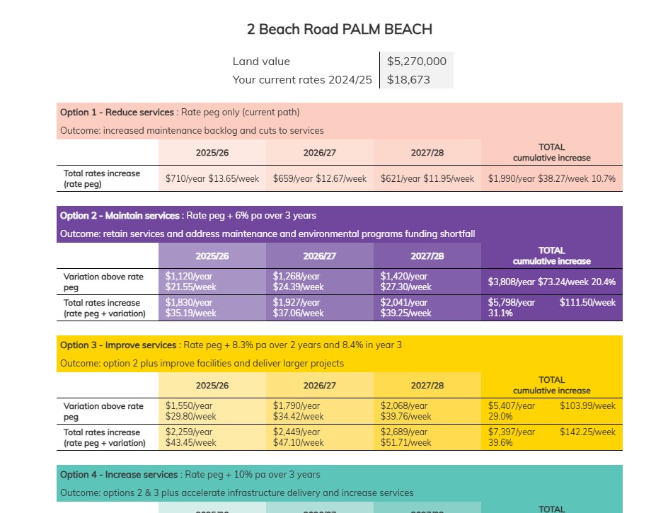 Another example: 37 Old Barrenjoey Road Avalon Beach; land value: $3,560,000, your current rates 2024/25: $12,614.00 and you will see an increase of $4997.00 per annum by year 3 or an extra $96 a week required.