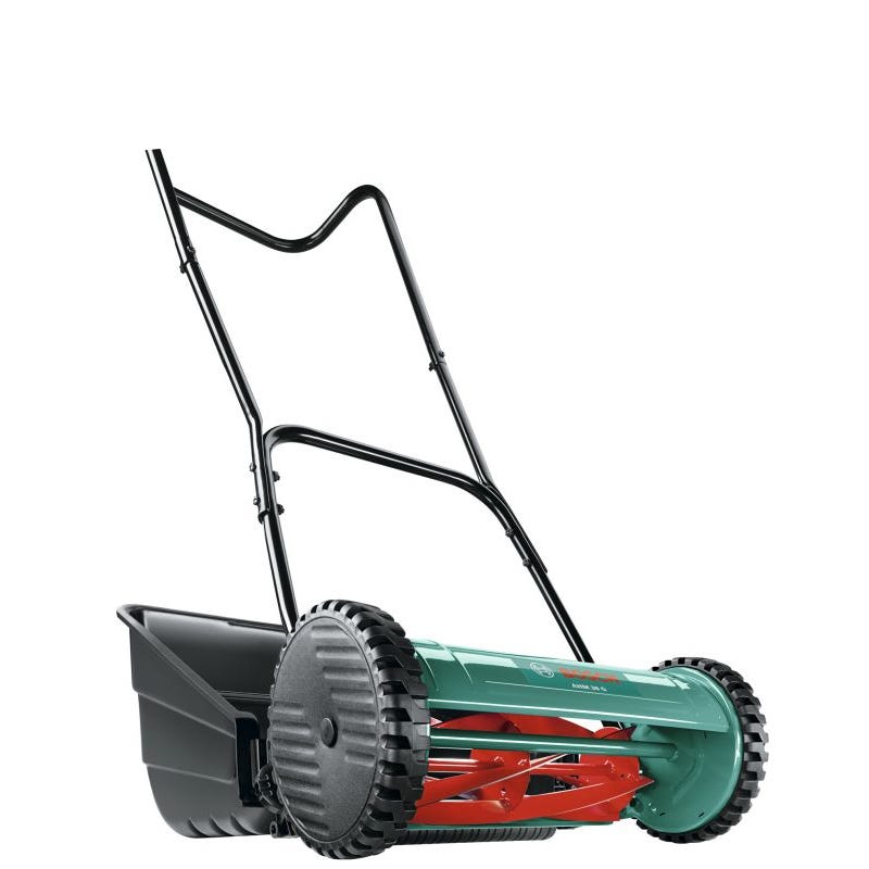 380mm. Cylinder cut system. 5 Curved blades. Includes grass catcher.