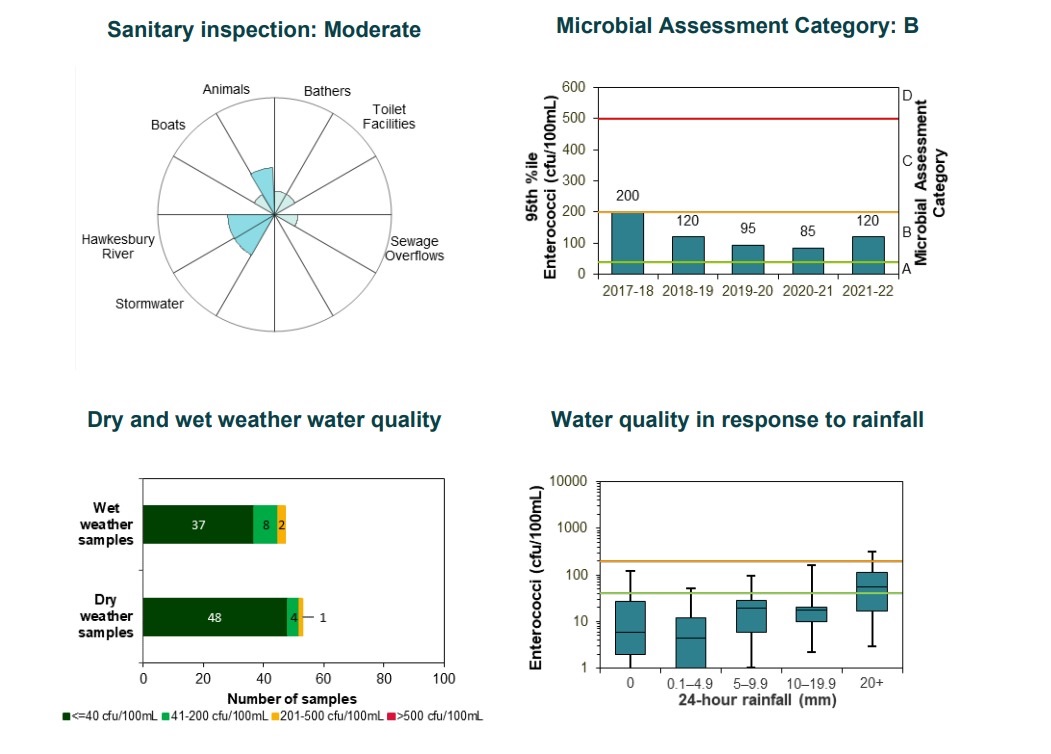 The Beach Suitability Grade of Poor indicates microbial water quality is susceptible to faecal pollution, particularly after rainfall and occasionally during dry weather conditions, with several potential sources of faecal contamination including stormwater and sewage overflows.