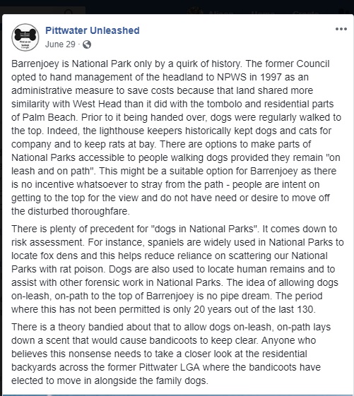There is plenty of precedent for "dogs in National Parks". It comes down to risk assessment. For instance, spaniels are widely used in National Parks to locate fox dens and this helps reduce reliance on scattering our National Parks with rat poison. Dogs are also used to locate human remains and to assist with other forensic work in National Parks. The idea of allowing dogs on-leash, on-path to the top of Barrenjoey is no pipe dream. The period where this has not been permitted is only 20 years out of the last 130.