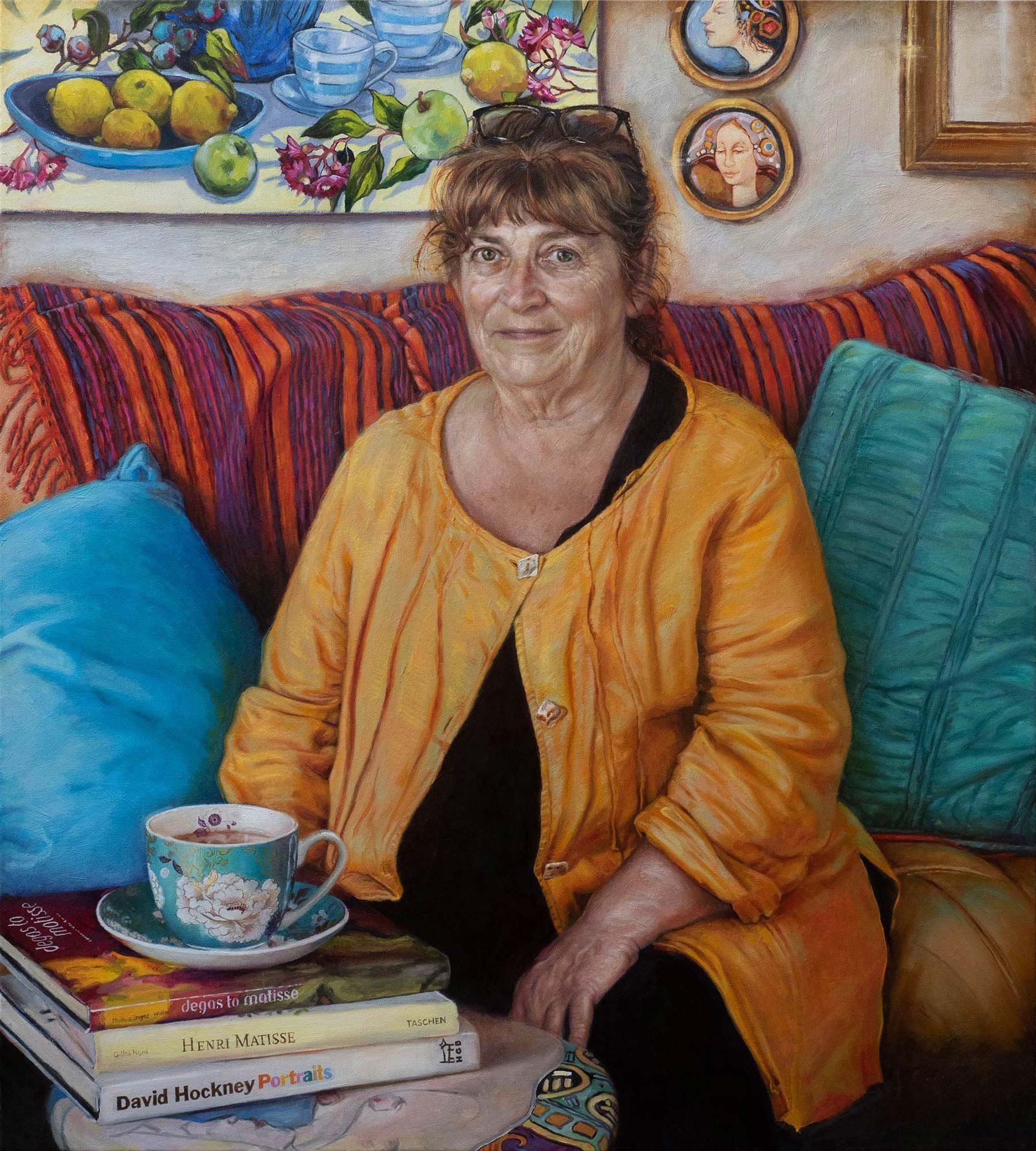 I wanted to portray an essence of Mignons colourful clutter having her sit comfortably within her cherished homely space where she has lived most of her life surrounded by her incredible art book collection, paintings and beloved knick knacks. ''