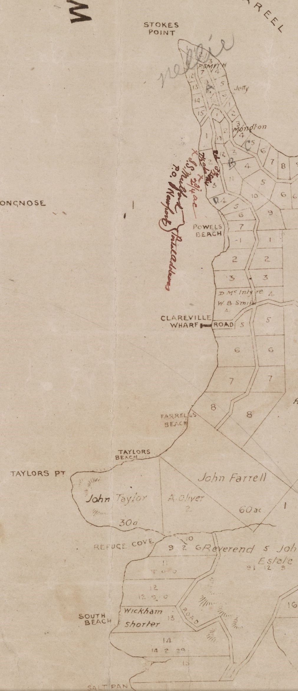 Sections from: Plan of Bay View and Pittwater district - No boundaries shown, circa 1900- 1901, Item No.: c053460078, courtesy State Library of NSW. Showing 'Powel's Beach', 'Clareville Wharf', 'Farrell's Beach' and 'Taylor's Beach'.