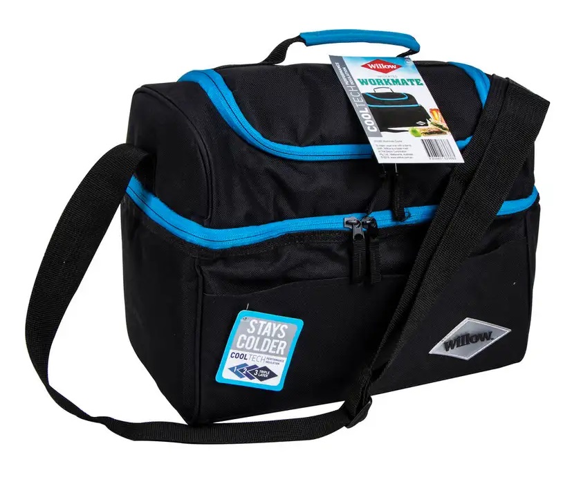 Includes: The Willow Workmate Cooler features triple-layer cool tech performance insulation designed to keep contents cool for hours when on-the-go; Large capacity for big appetites and holds up to 19 cans; Removable adjustable cross-body strap and an easy-carry padded handle; Exterior pocket to hold keys, phone, wallet, and more with two handy compartments with separate access zips; Made from durable and tough material and an easy clean liner simply wipe with damp cloth; The leak-proof welded cooler bag liner is free of BPA