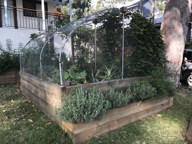 Tim’s garden is a custom built, raised “U” shaped veggie bed with a frame and metal cage over it to stop wildlife getting in. It is also a wicking bed which is fed by a water pump on a timer.