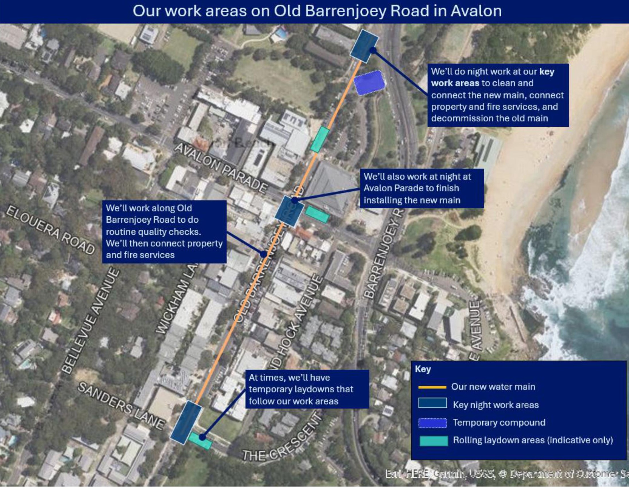 Sydney Water state they will start by doing some routine quality checks on the new water main at night between The Crescent and Avalon Parade. This may involve some potholing and excavation at times.