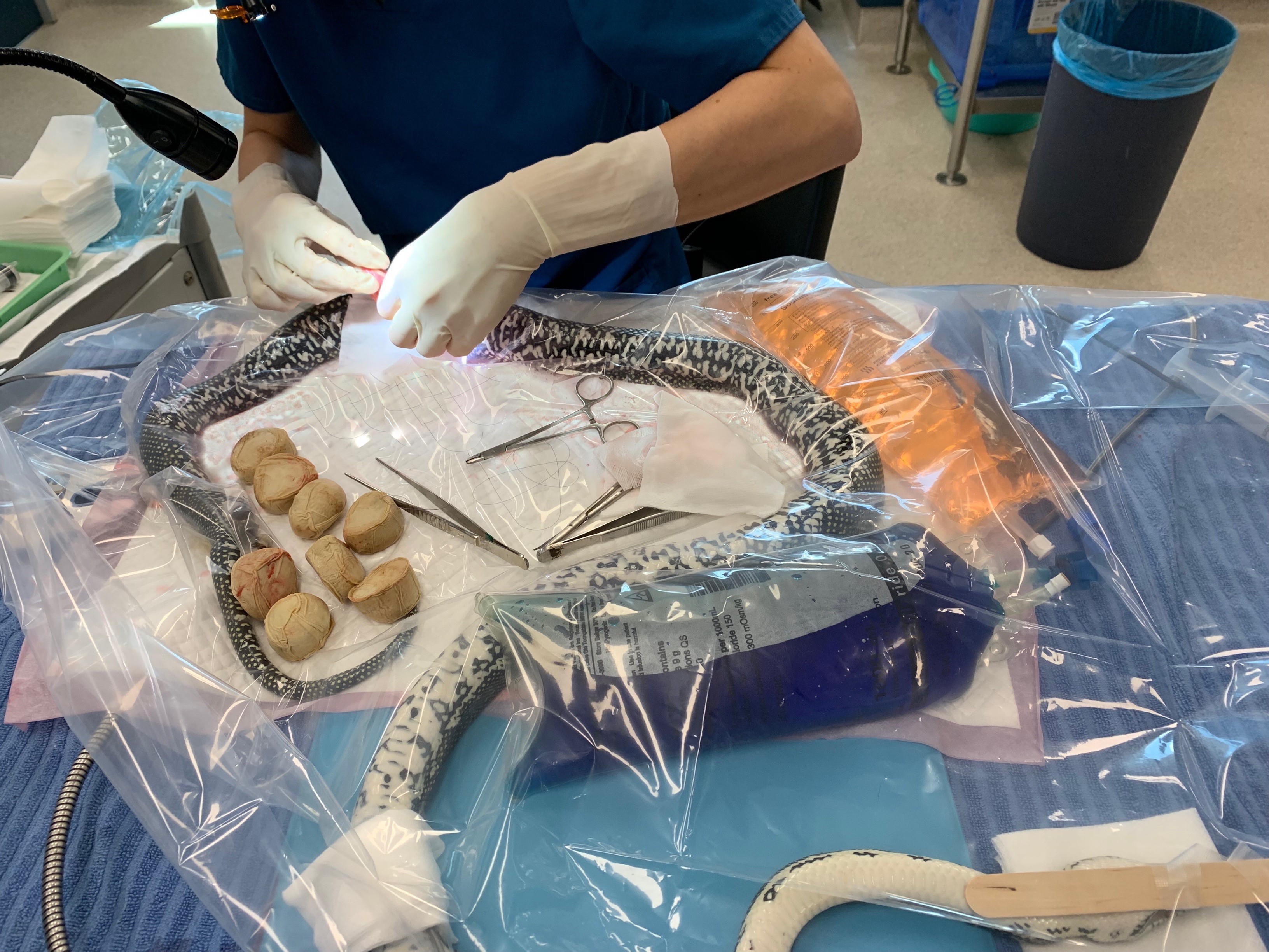 Dr Izidora of AVES in Terrey Hills performing a salpingotomy on a wild python with disruptive dystocia (egg-bound). And Dr Anne from Mona Vale Vet Hospital about to amputate a necrotic section of a diamond python’s tail.