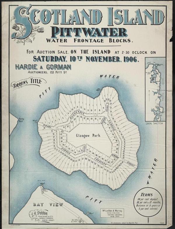 That picturesque spot at Pittwater known as Scotland Island, containing about 130 acres, was offered at auction on May 3 by Messrs. Richardson and Wrench, Limited, by order of the mortgagee. After £1100 had been bid, the property was with-drawn, that price being much under the mortgagee's valuation. COUNTRY NEWS. (1900, May 12). Australian Town and Country Journal (Sydney, NSW : 1870 - 1907), p. 12. Retrieved from http://nla.gov.au/nla.news-article71380613