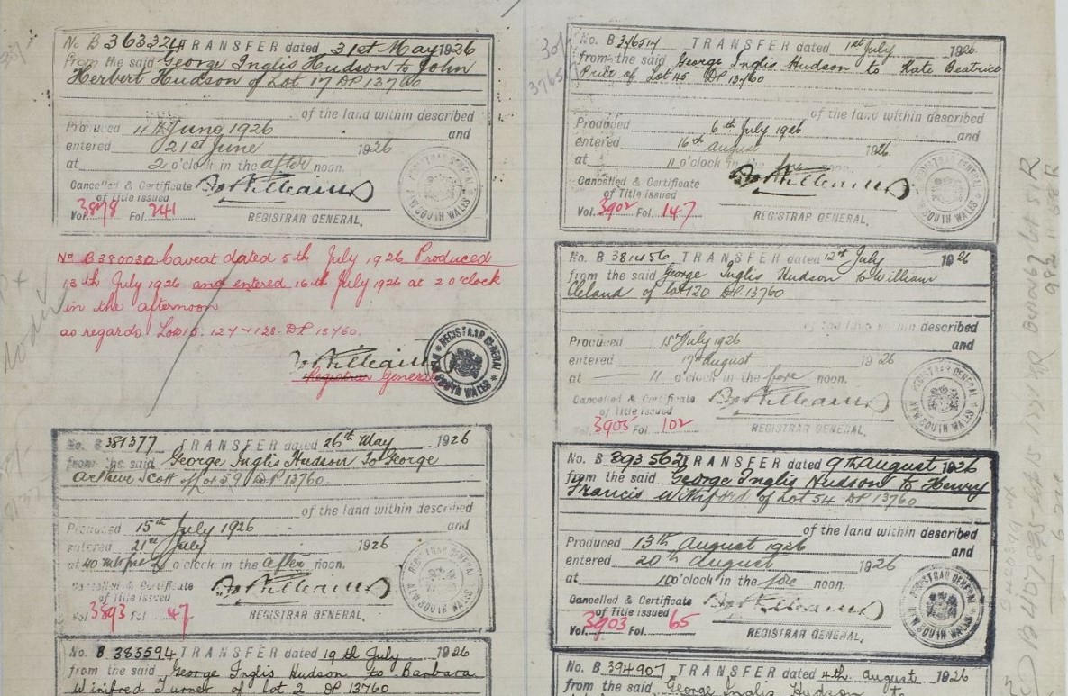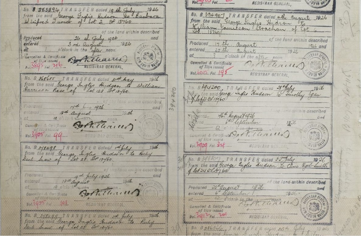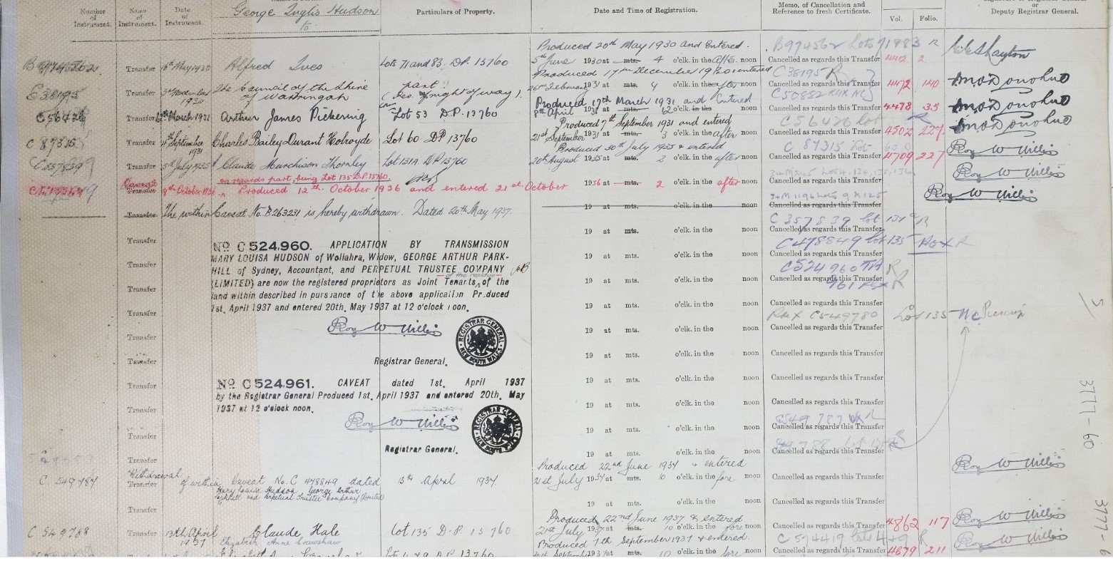 Primary Application - Sydney Robert Lorking and Henry Green - 36 acres at Pittwater in Shire Warringah Parish Narrabeen County Cumberland Volume 3777 Folio 60 Date range: 14/07/1919 to 17/09/1920. Item Number Or Control Symbol: PA 22062 – George Hudson's Certificate of Title was registered in 1925 - it encompassed Taylors Point and was surveyed as being 36 acres.