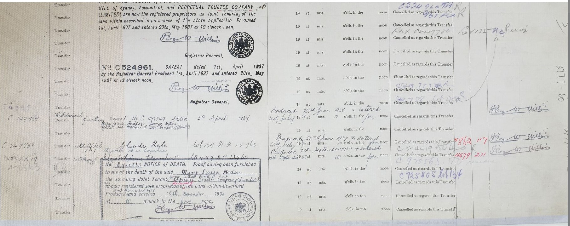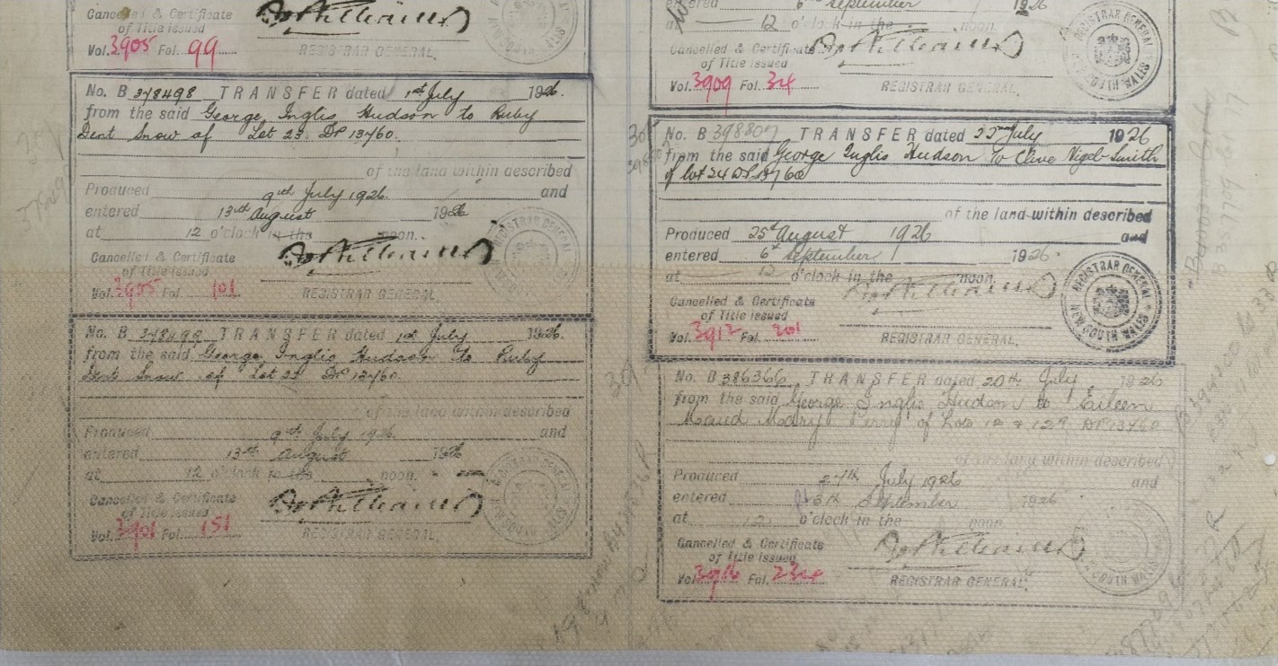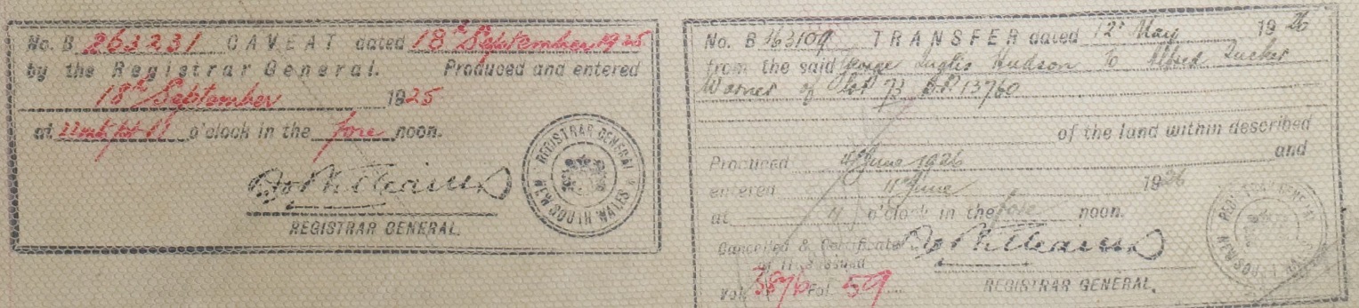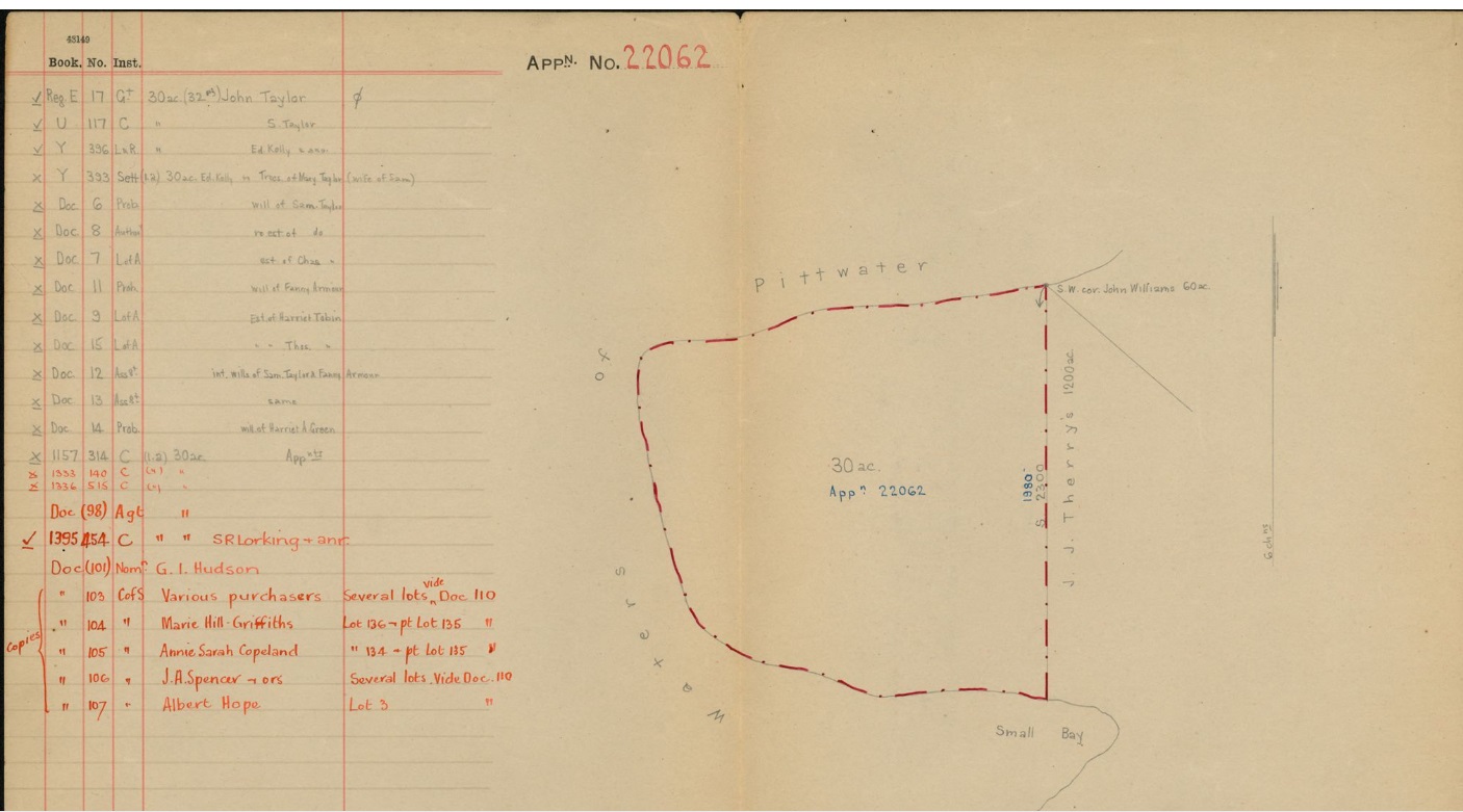 Primary Application - Sydney Robert Lorking and Henry Green - 36 acres at Pittwater in Shire Warringah Parish Narrabeen County Cumberland Volume 3777 Folio 60 Date range: 14/07/1919 to 17/09/1920. Item Number Or Control Symbol: PA 22062 – George Hudson's Certificate of Title was registered in 1925 - it encompassed Taylors Point and was surveyed as being 36 acres.