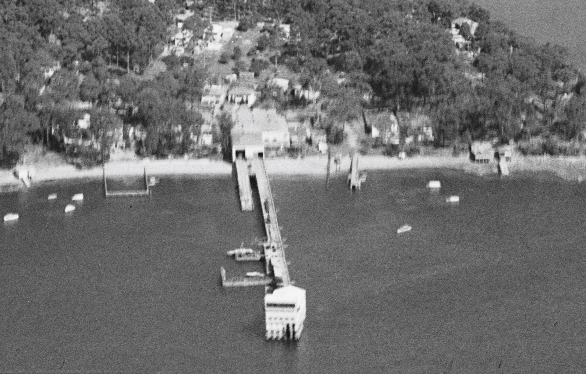 Pittwater, September 1949, ACP Magazines Ltd. photographic archive including Pix magazine negatives, 1930s-1980s, courtesy Australian Consolidated Press and Consolidated Press and Mitchell Library, State Library of NSW - Section from showing Taylors Point wharf with baths alongside and much bigger and longer torpedo wharf beside it - item: SLNSW_FL18904354.
