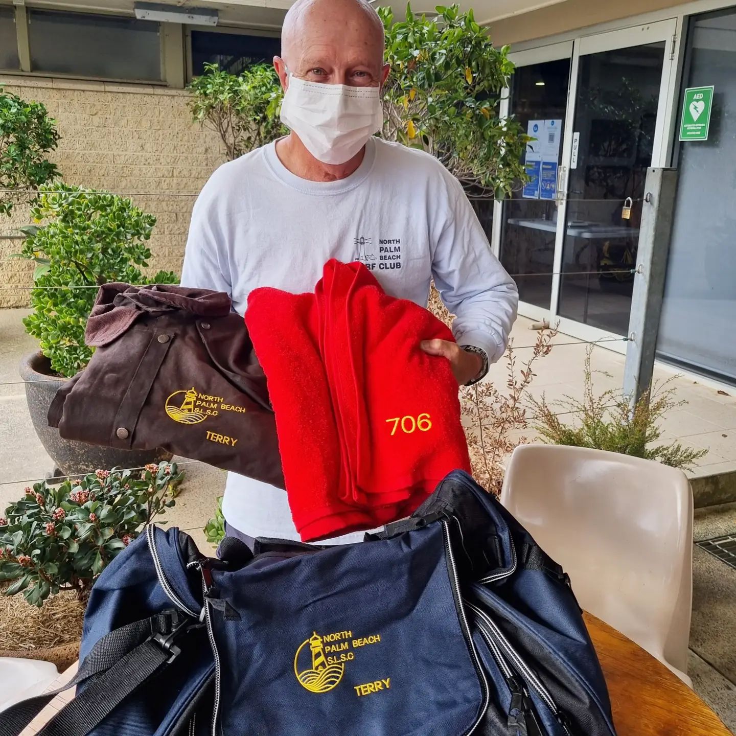 For his dedication to Surf Lifesaving Terry was recently awarded a monogrammed 100% patrol towel (received by all patrol members that attended 100% of their patrols last season) plus a North Palmy bag and an amazing Drizabone coat.