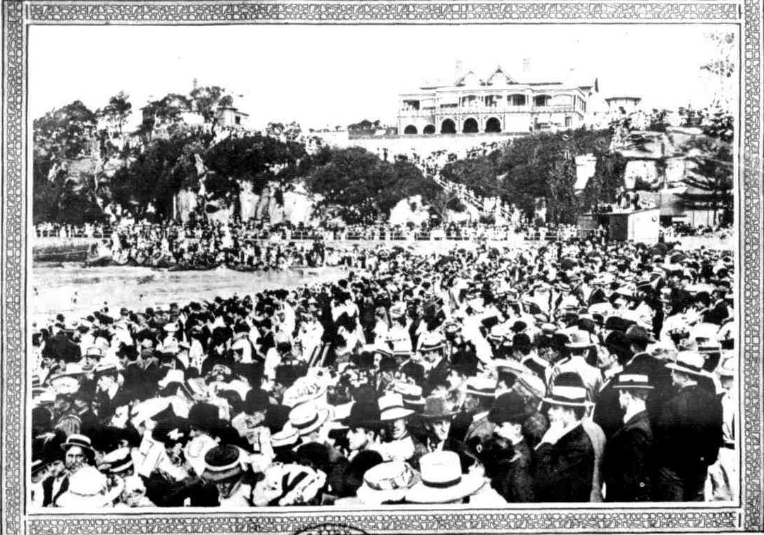 The crowd for the launch of this first Manly Surfboat and the attendees at the Carnival it formed part of, was estimated at 12 thousand in some reports: