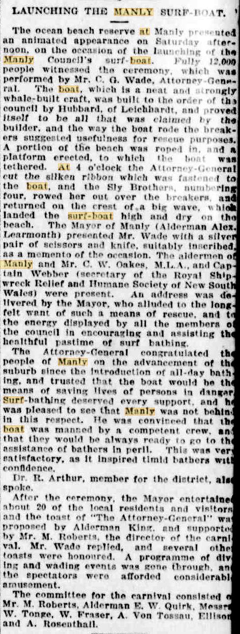 The Attorney-General (Mr. Wade) spoke at some length on the subject of the advancement of the suburb. He recognised the Importance of the ceremony of launching the boat. It would be a means, should the occasion ever arise, of saving lives of persons in danger. Surf-bathing at Manly had become a success, and it was so largely indulged in that the place was becoming celebrated for it and not only hundreds but thousands were attracted to the suburb for that reason alone. Surf -bathing deserved every support, and he was happy to say was receiving it The surf- boat was manned by a competent crew, and was always ready to go to the rescue of bathers and others in peril. There was much satisfaction to be derived from this fact alone, which was a matter inspiring confidence in the timid bather. IN THE MANLY SURF (1907, March 24). The Sunday Sun (Sydney, NSW : 1903 - 1910), p. 1. Retrieved from http://nla.gov.au/nla.news-article227141932