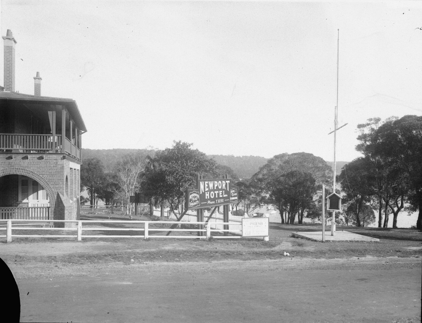 From album 'Samuel Wood - postcard photonegatives of Avalon, Bilgola and Newport, ca. 1928', Hotel - Newport. Item No.: a1470006h, courtesy State Library of New South Wales - an enlarged section shows the name of licensee - A. W. Newbery - Captain Alfred William Newbery was not at Newport Hotel until at least 1930. This photo shows flagpole still in place that was used as an Anzac Day gathering place and would later be moved to Trafalgar Park when a Memorial was built there to honour those who had served Australia in conflicts.