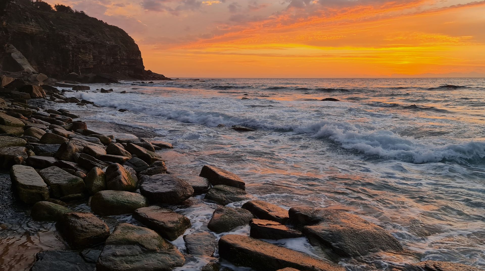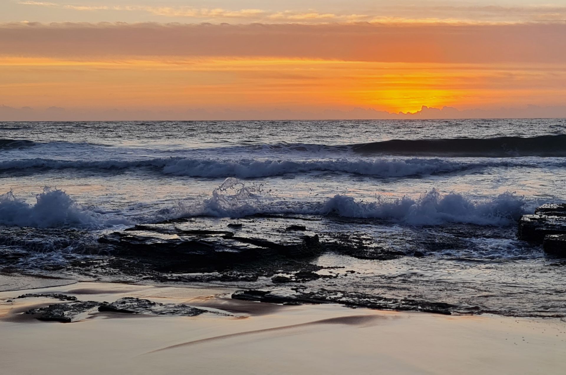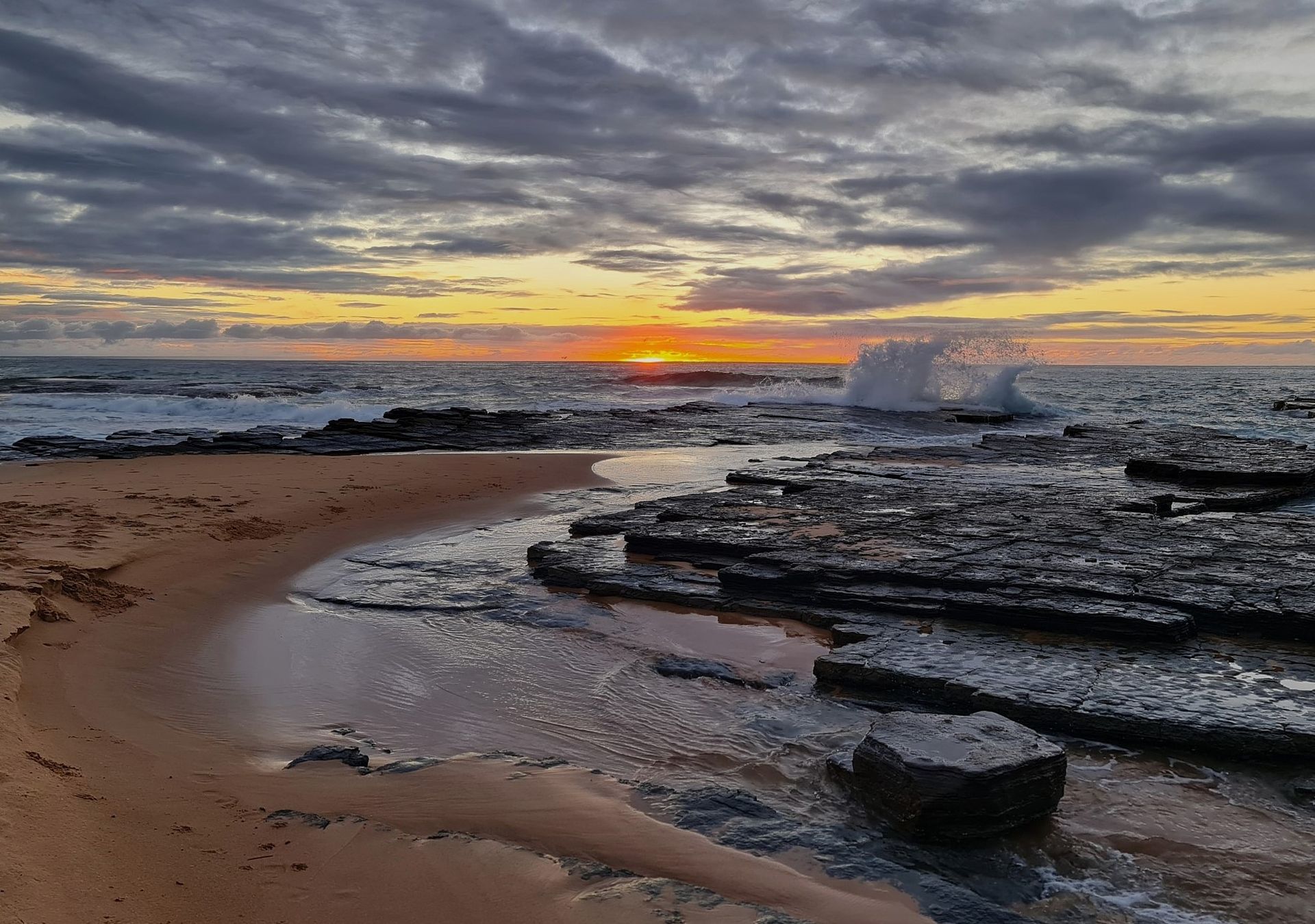 Turimetta Beach sunrise, waves breaking on rocks at southern end, March 6, 2025