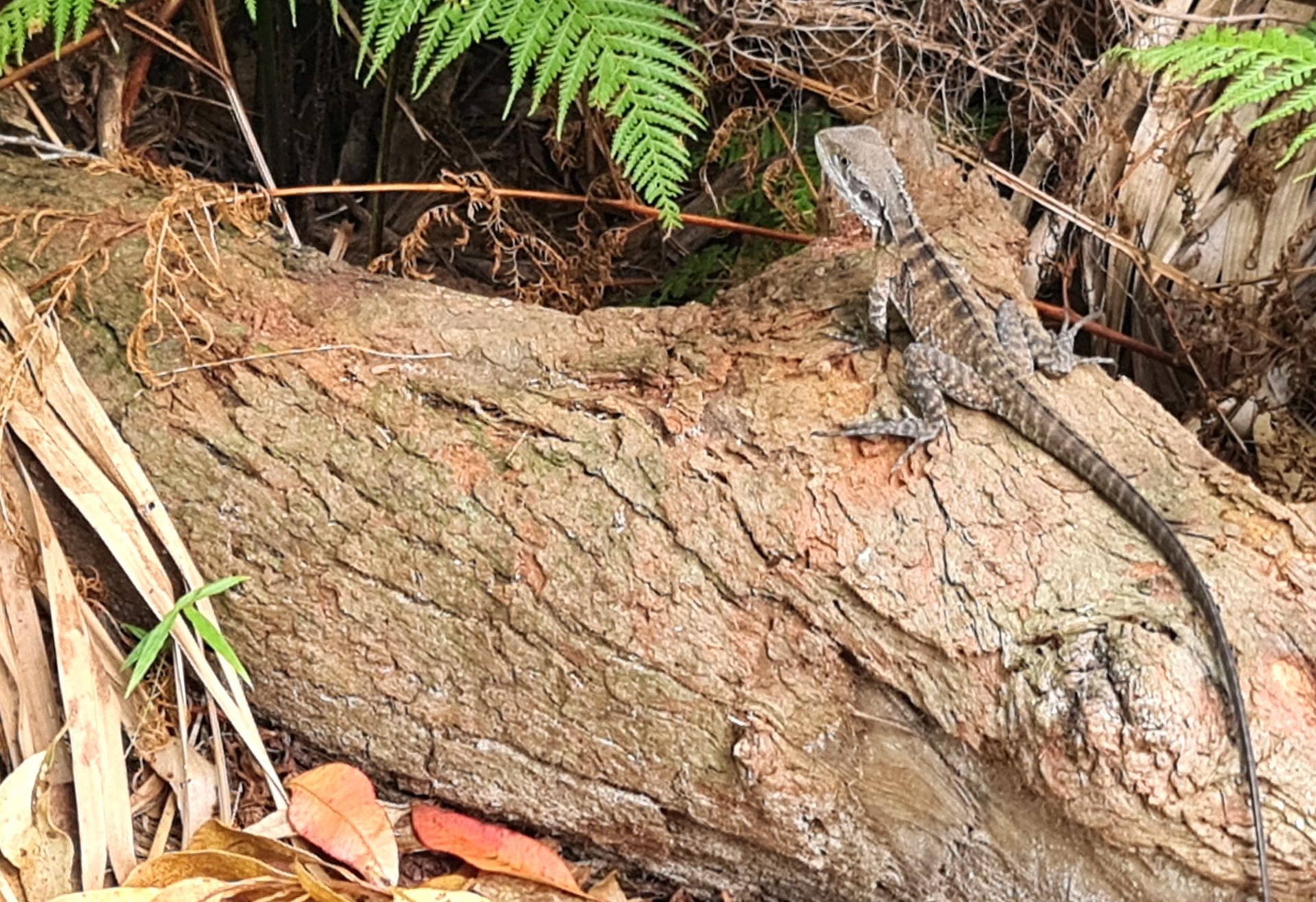 Baby water dragon at Warriewood Wetlands - palm leaf size
