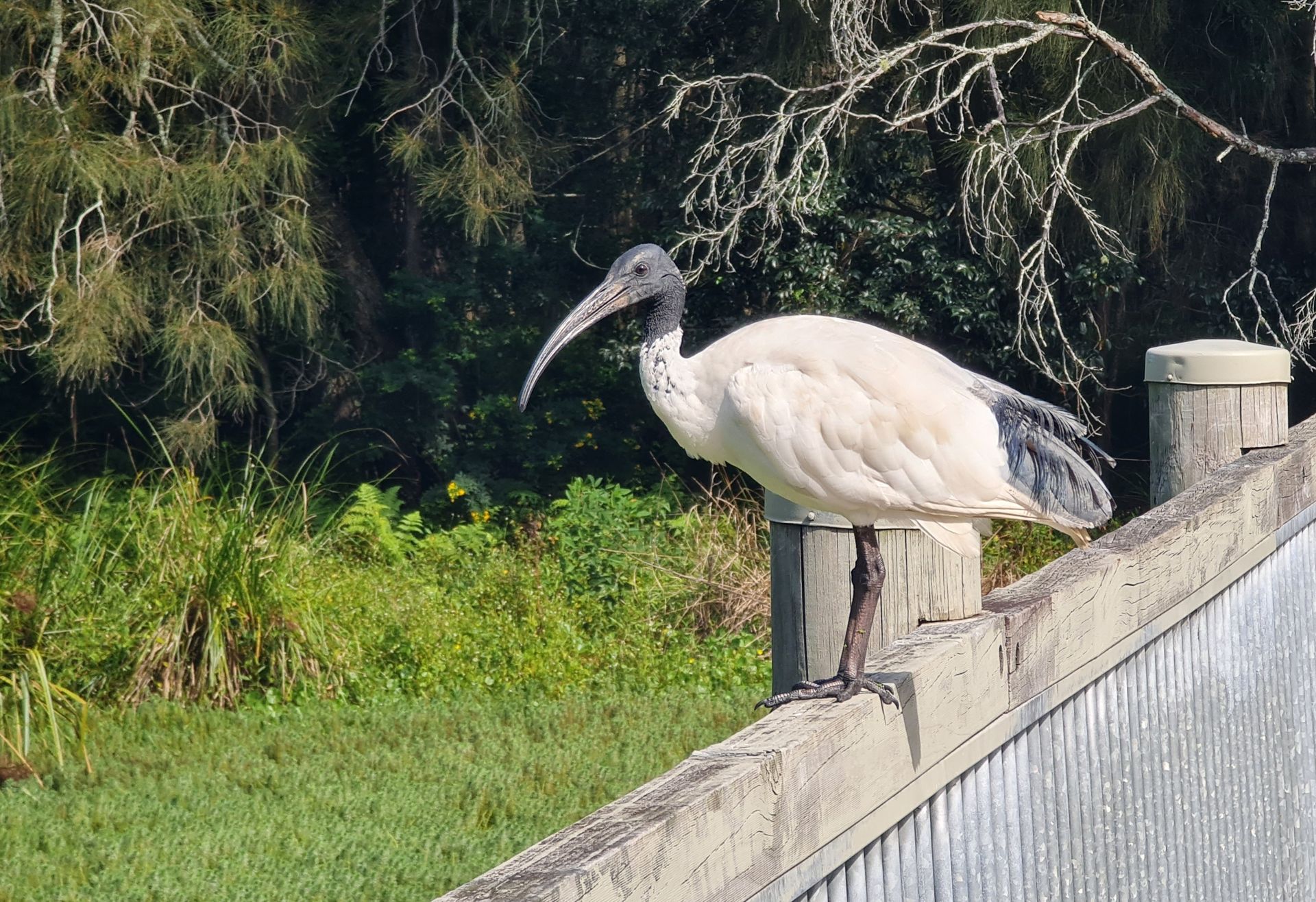 Australian Ibis, Threskiornis molucca, on the walkway rails at Warriewood Wetlands, February 24, 2025