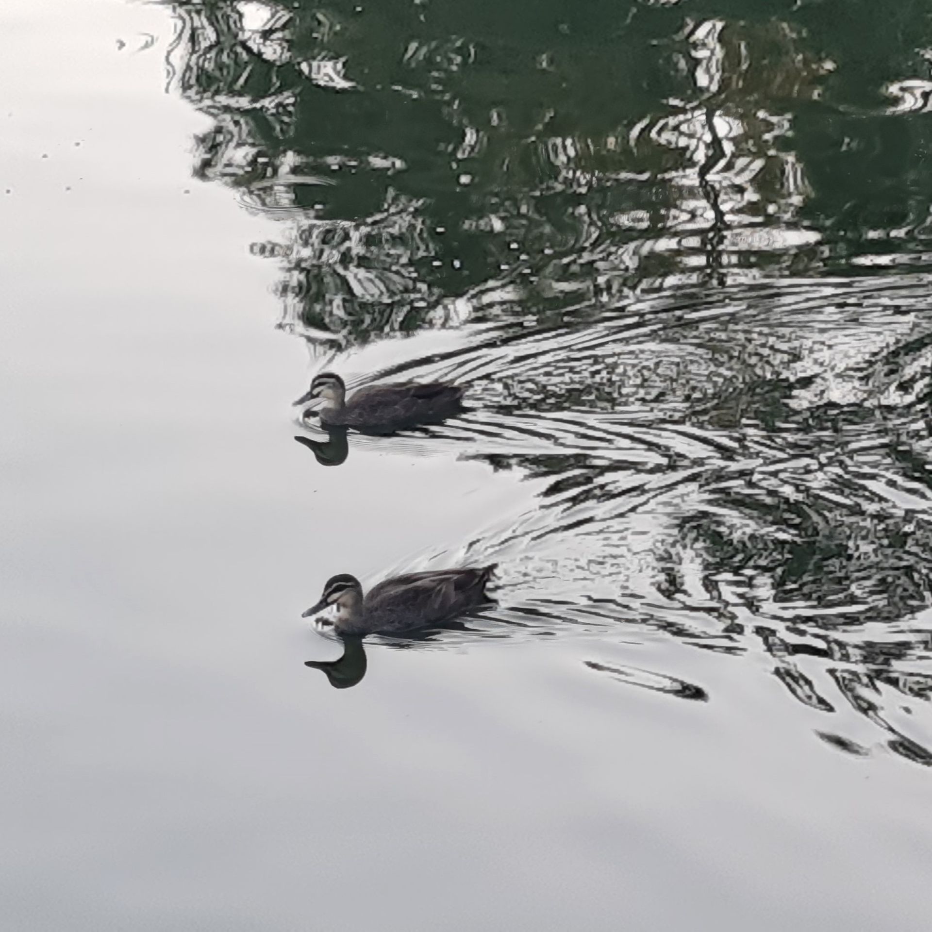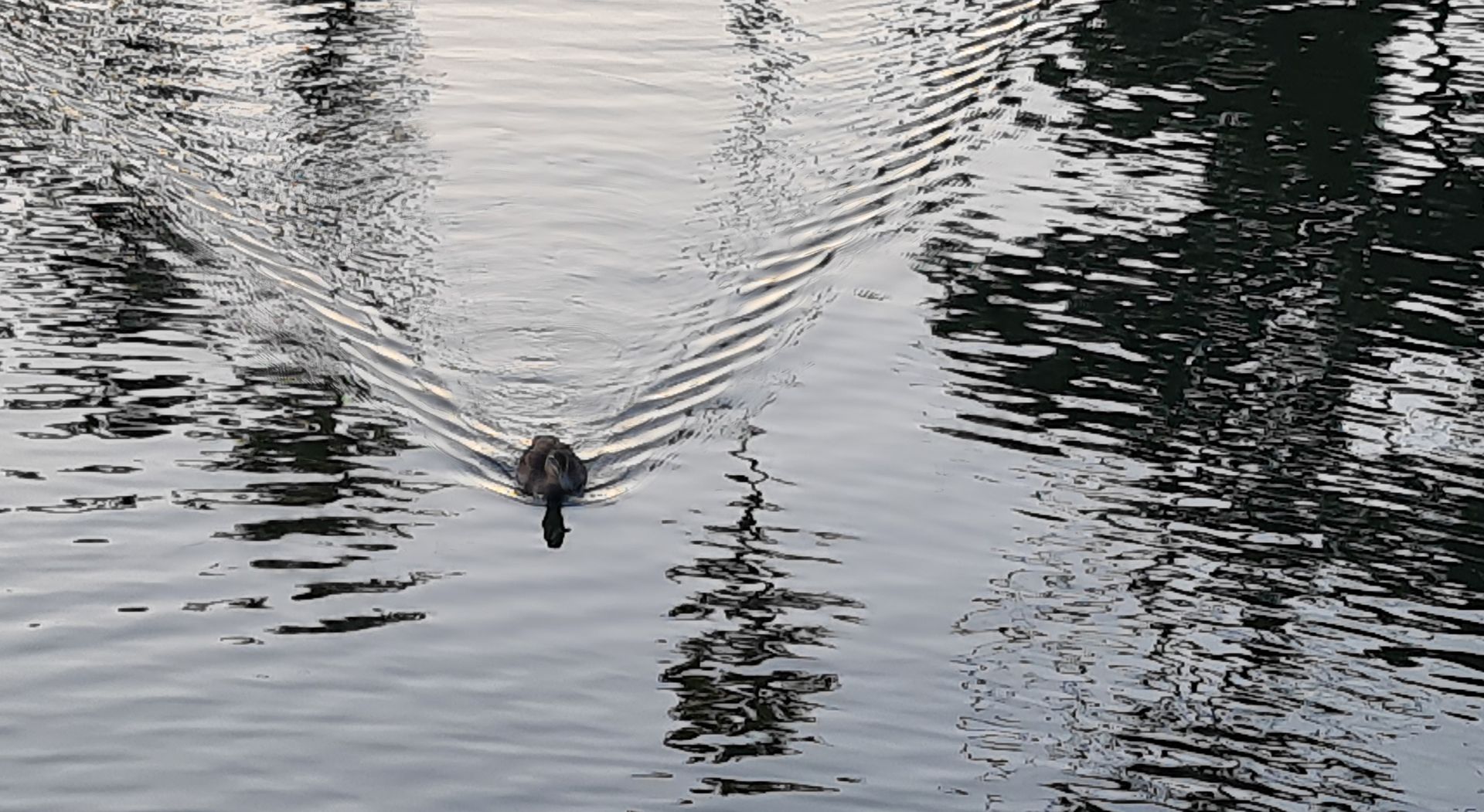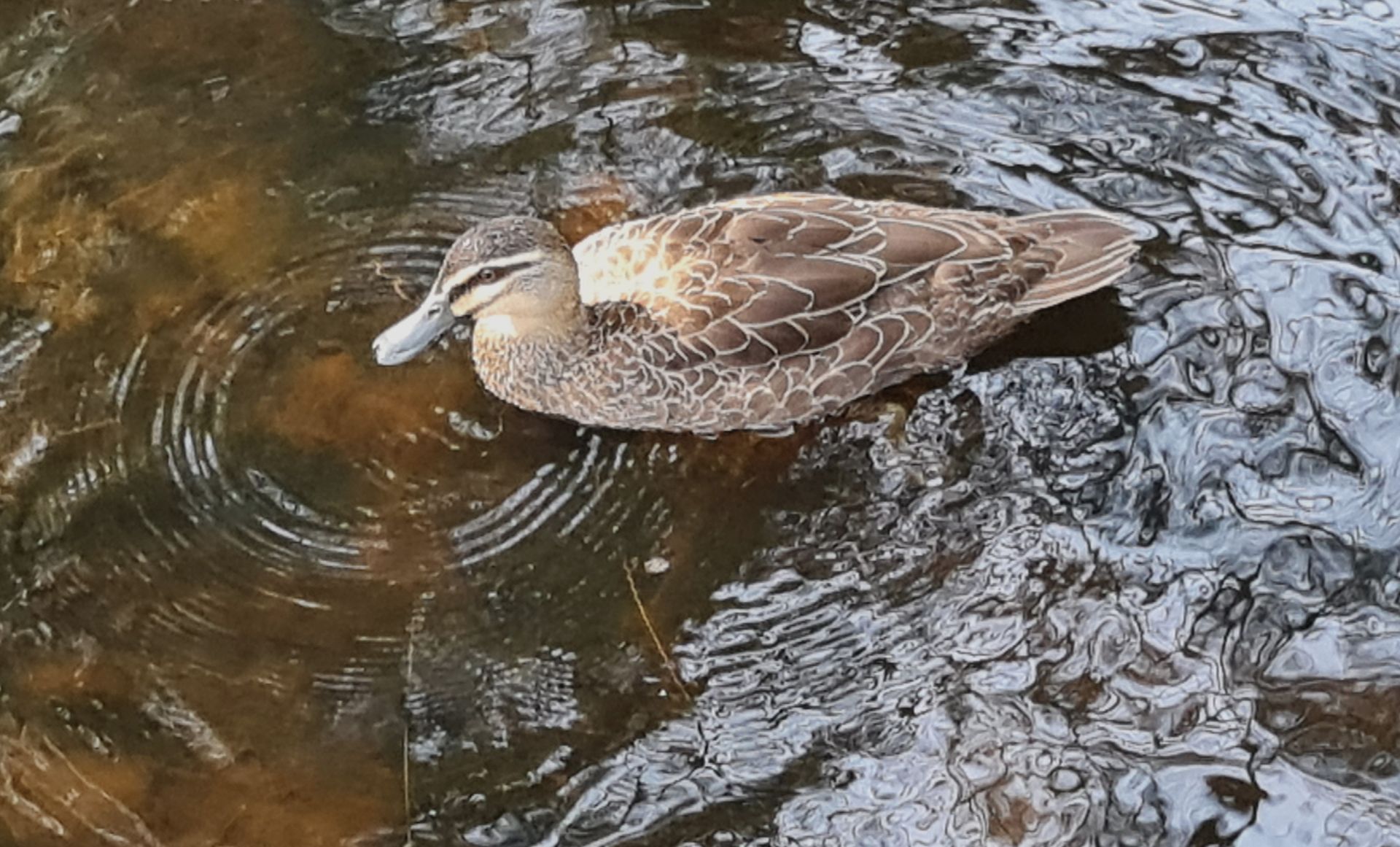 Narrabeen Lagoon, Pacific black duck, Anas superciliosa, water trails, near bride and Woolworths, February 28, 2025