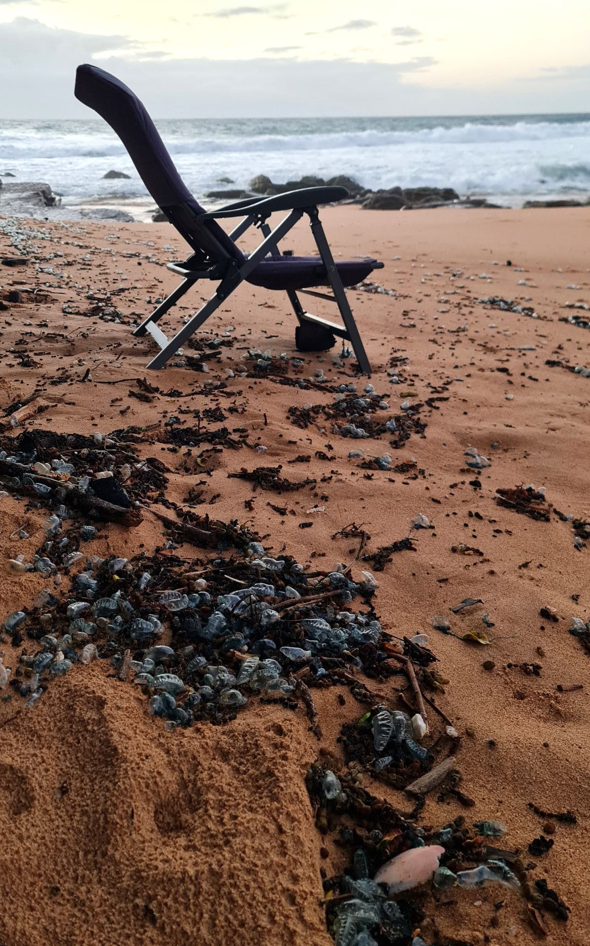 Turimetta Beach, bluebottles washing up on the shore at north end, March 7, 2025