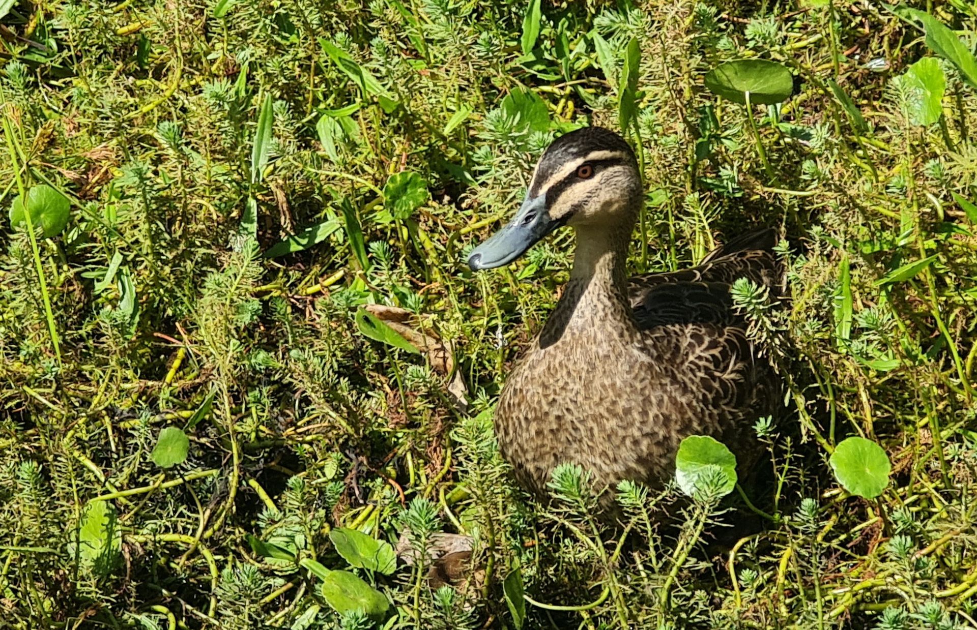 Pacific black duck, Anas superciliosa, at Warriewood Wetlands among weeds choking wetlands, March 9, 2025. This is Parrot's feather (Myriophyllum aquaticum) a semi-submerged aquatic weed that grows in coastal waterways of eastern Australia. It is native to South America and can form dense stands within a waterbody, impeding water flow and altering natural habitats.