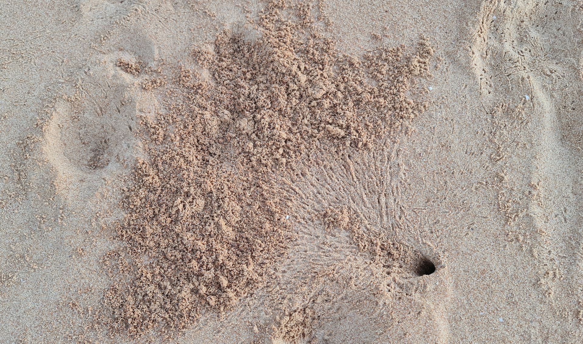 Turimetta Beach, sand crab refuse being thrown from nest, March 13, 2025