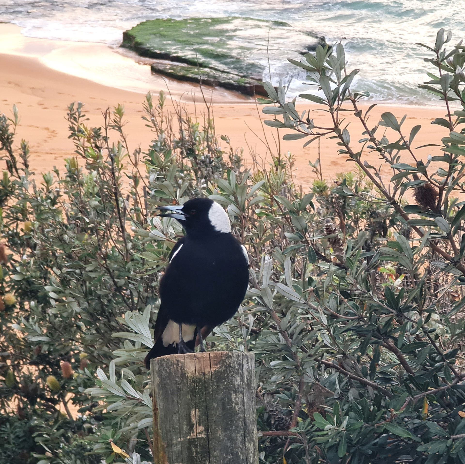 Magpie on Post, Turimetta beach, near southern end steps, Fourth Day of Spring 2025, Thursday September 4