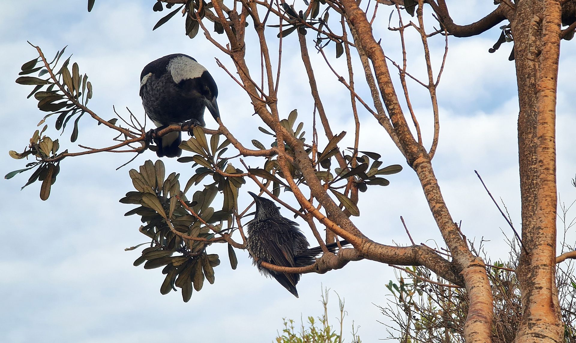 Wattlebird with nearby nest chasing a magpie, Turimetta Beach, Fourth Day of Spring 2025, Thursday September 4