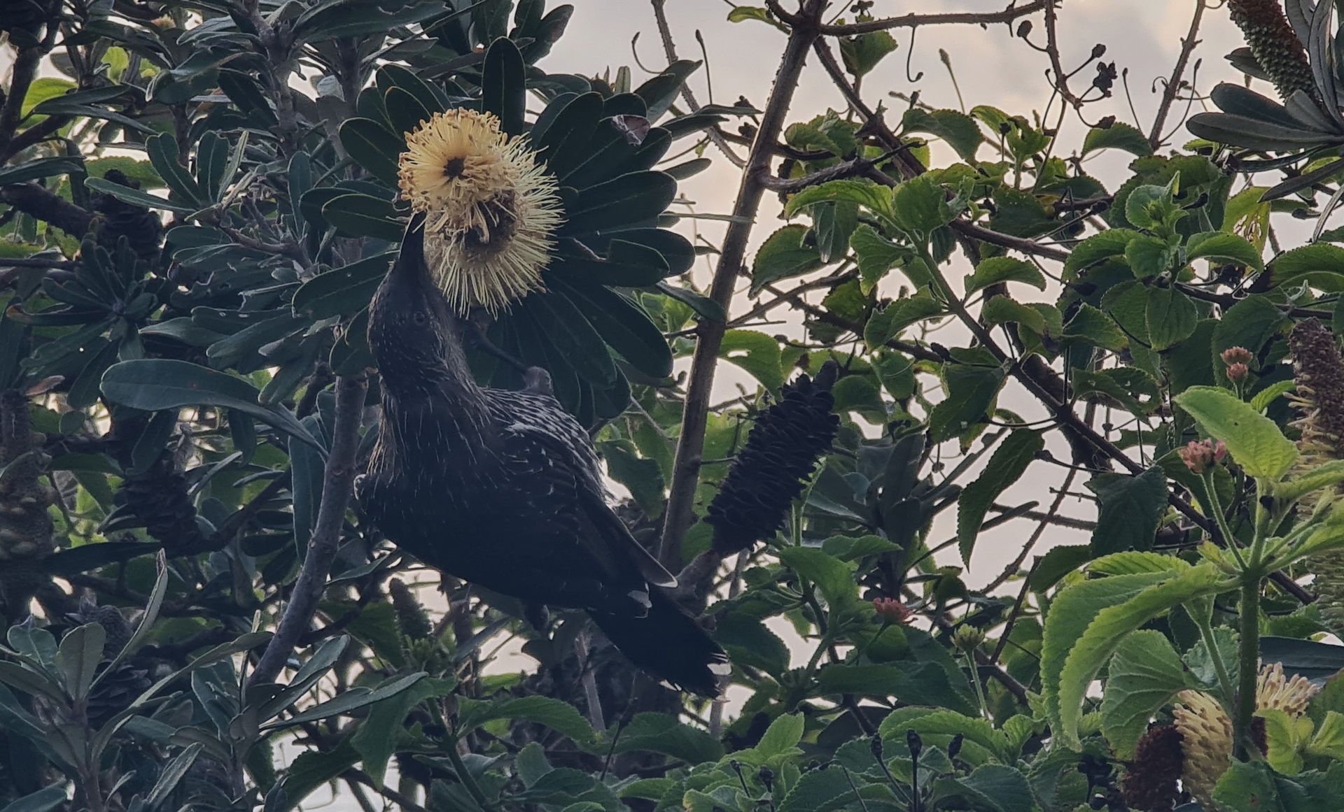 Turimetta Beach resident wattlebird feeding on Old Man Banksia tree flower