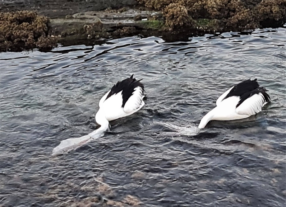 - Pelicans fishing in shallow rock pools