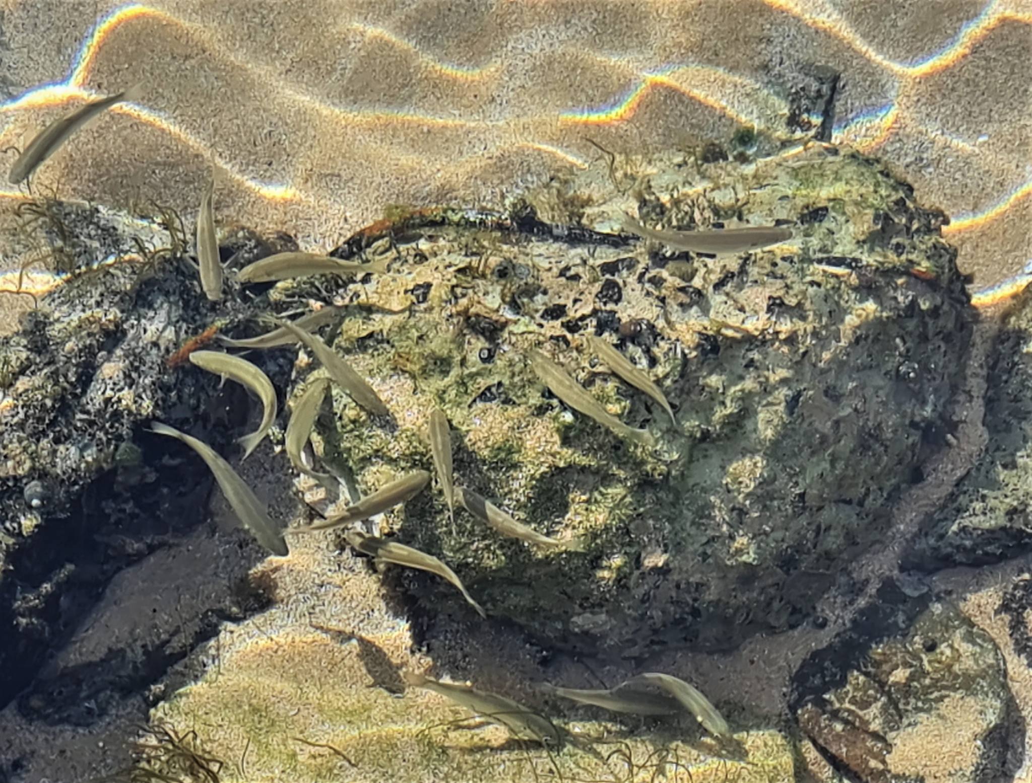 Another non-sunrise pic. This one was taken at the Narrabeen Rock Pool near the northern wall, in the tidal shallows. It shows a school of baby fish feeding off algae, and I suspect a bit of limestone, of this lump of discarded concrete block. Not sure what the species of fish they are? Enjoy.