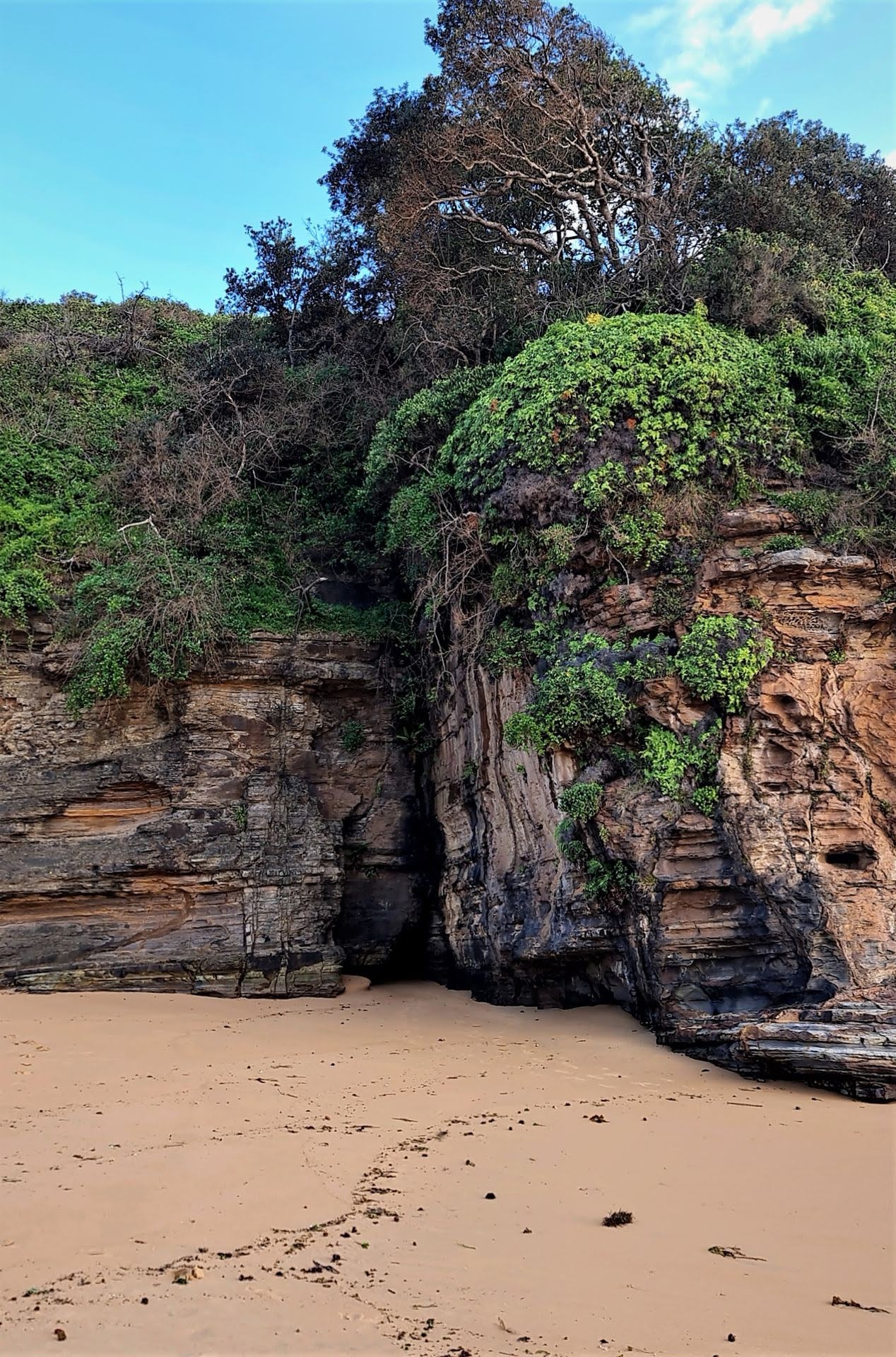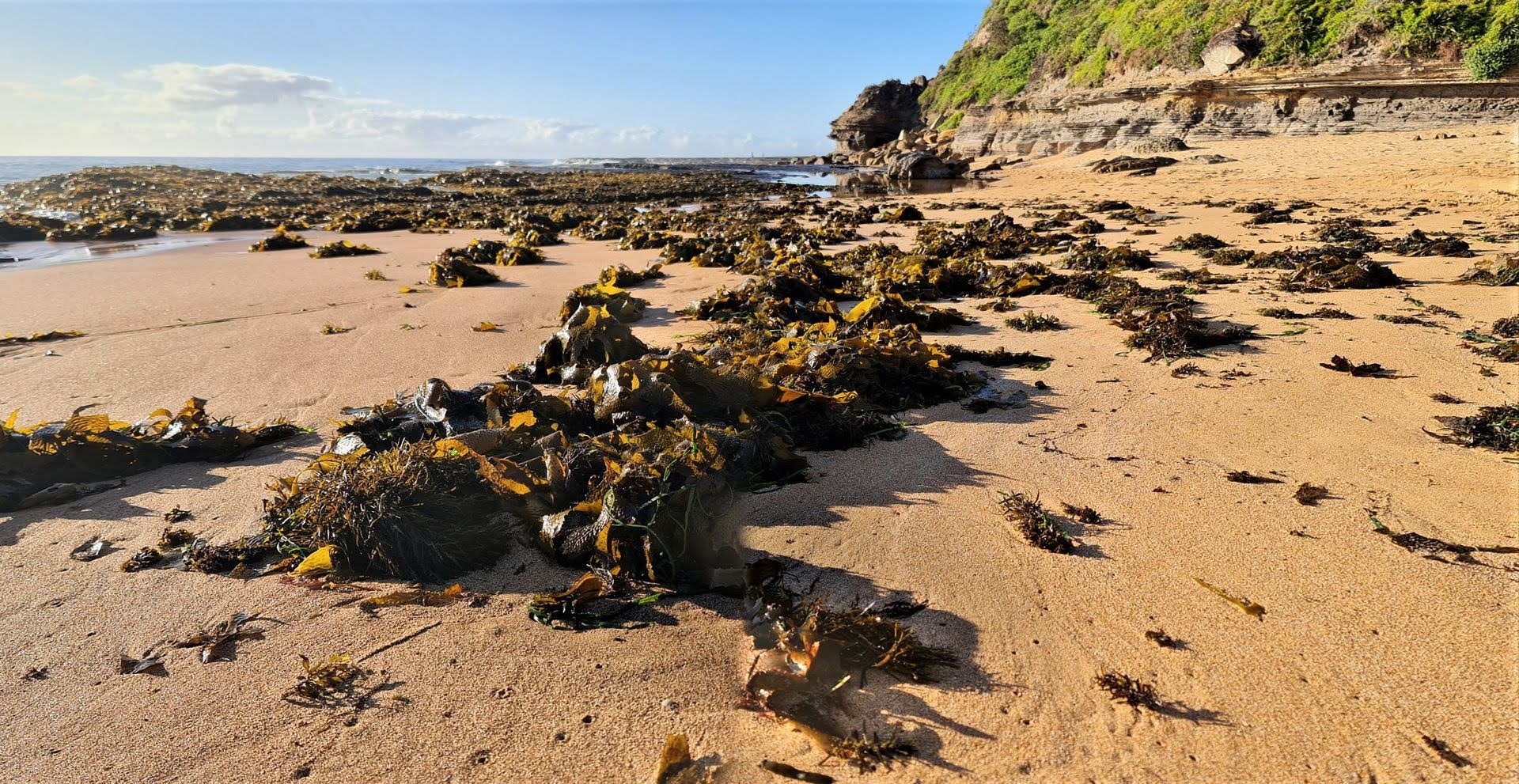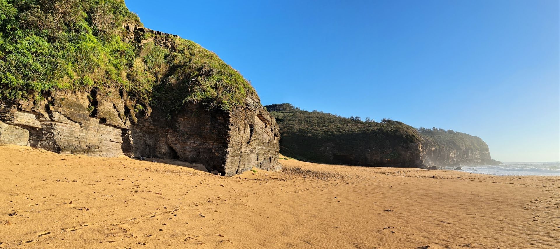 - Exposed rocks at both headlands