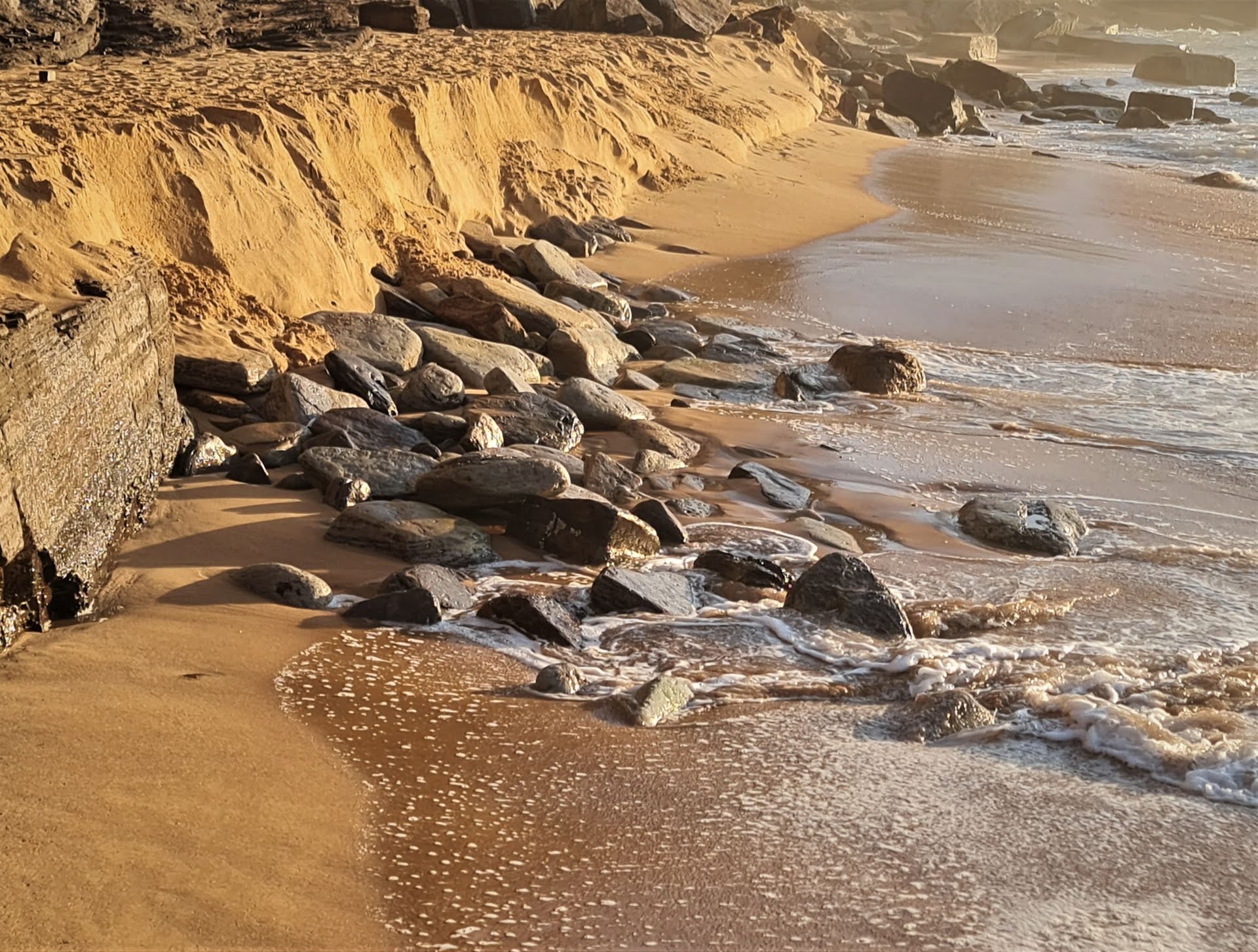 The continuing sand movement has been massive, changing weekly. There is a lot of erosion in the middle of the beach, and the rocks at the northern end are being exposed again. The southern end of the beach has been completely covered in sand, with no signs of the rocky gutters.