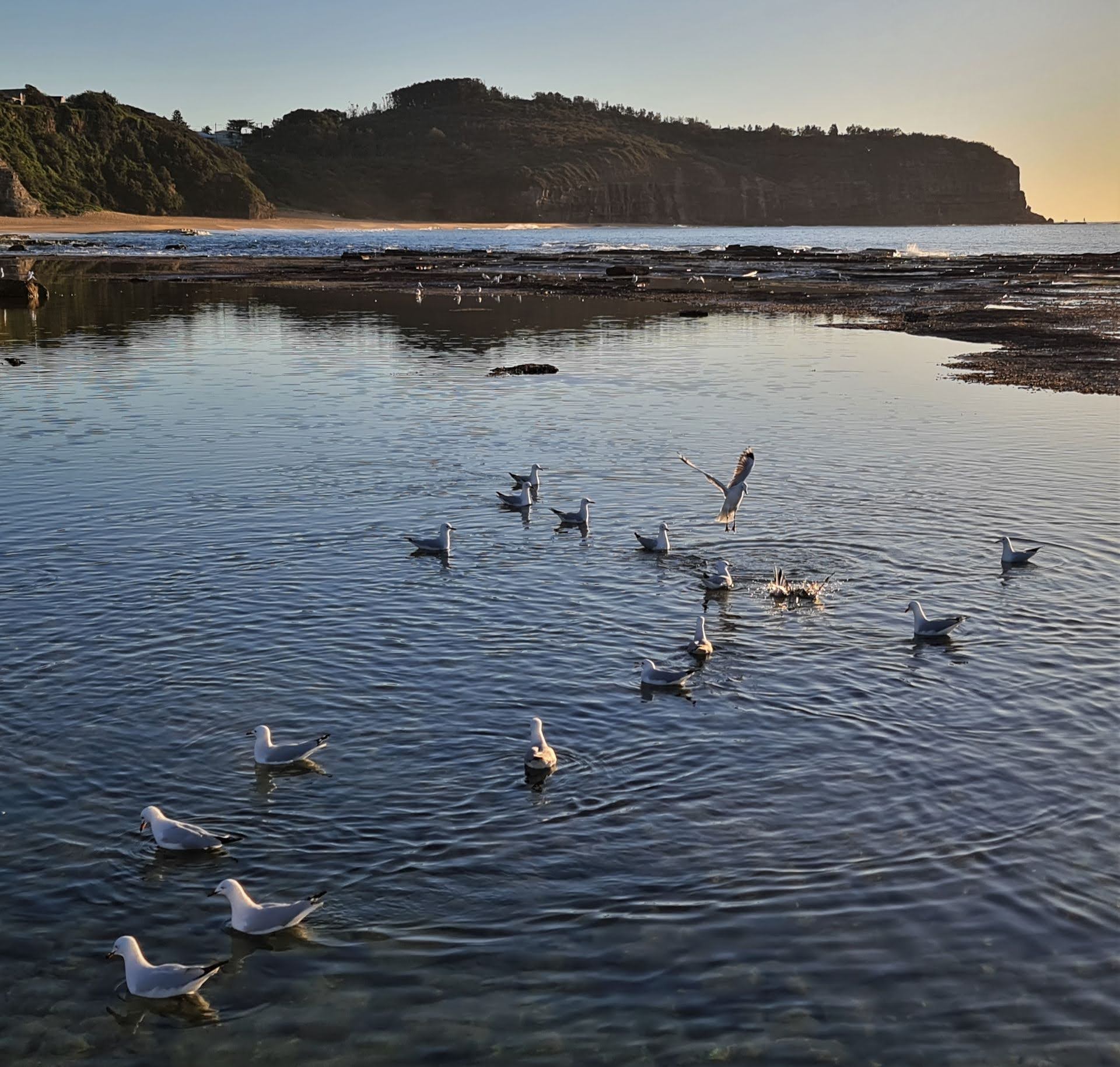 - Seagulls chasing trapped fish in tidal pool