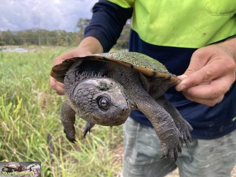 A large freshwater turtle in Queensland. Citizen scientists throughout the country are learning to record turtle sightings and stopping turtles dying on roads or from predators. TurtleSAT