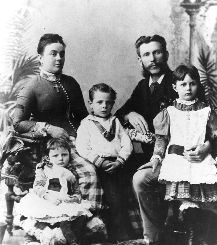 This first photo shows Catherine, Frank and three of their children: Katie Elvina (standing), 7 years, known as Elvina; Stephen Vivien (standing), 5 years, known as Vivien, and Hilda Mary (sitting), 3 years old. (Note: Their fourth daughter, Agnes Florence (known as Florence), was born in 1890.)
