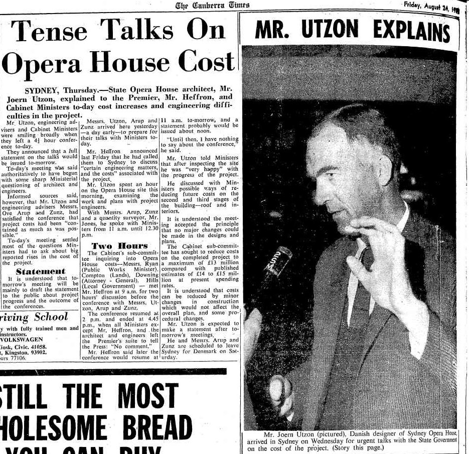 It is realised that the construction of an Opera House is a costly undertaking, but the country has probably never been more prosperous than at present, and the acquiring of such a building would be passing on some tangible asset to poserity, just as we have received many fine gifts such as the University of Sydney, the National Art Gallery and other buildings from the past. It is such edifices, representative of the cultural life and aspirations of the people, that, together with its economic and commercial aspects, constitute a great City. Mr. Goossens has been the spearhead of this Opera House crusade, which we hope will materialise on the best site available with the finest building that can be secured. Editorial (1954, October 27). Construction (Sydney, NSW : 1938 - 1954), p. 1. Retrieved from http://nla.gov.au/nla.news-article224517960