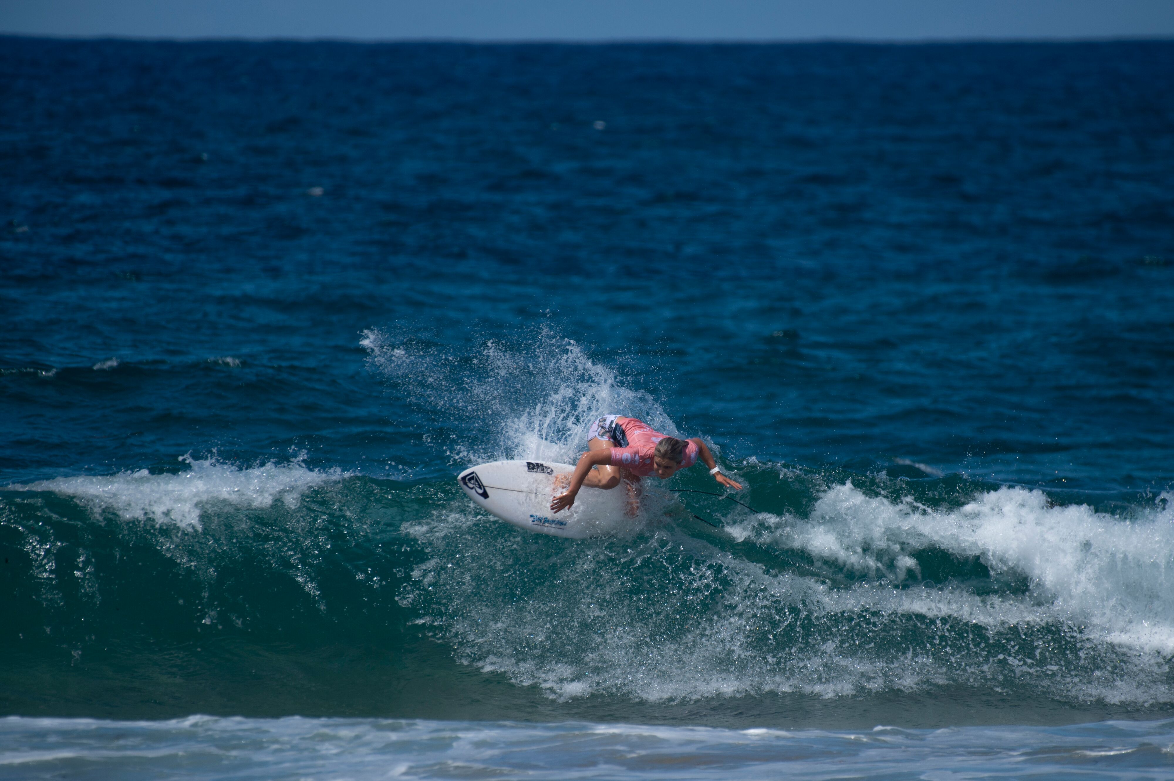 Hailing from Shelly Beach just a short journey north of Avoca, Saxon Lumsden was relishing the opportunity to compete in a WSL event so close to home. The powerful natural-footer surfed a busy heat, catching nine waves to progress in second place behind Miyu Fuwukawa.