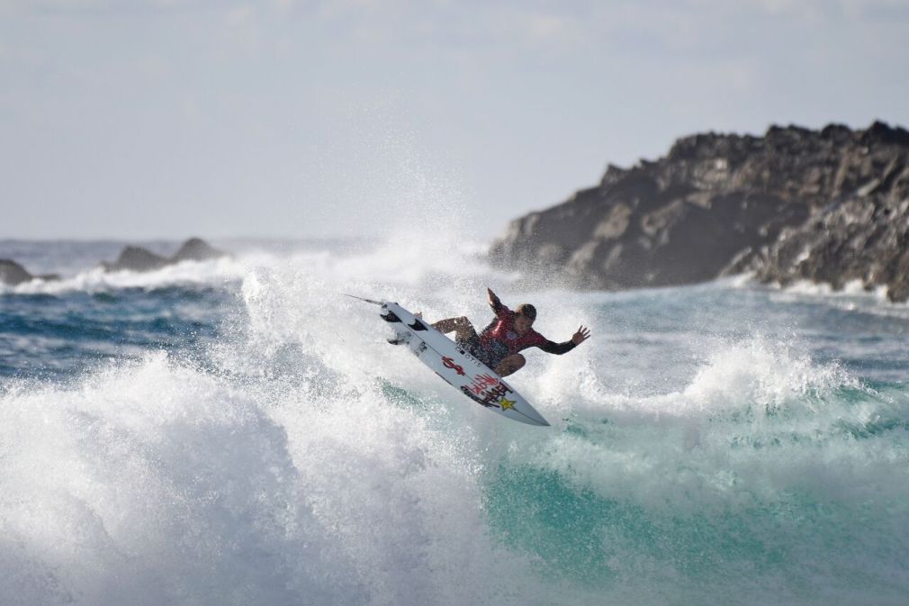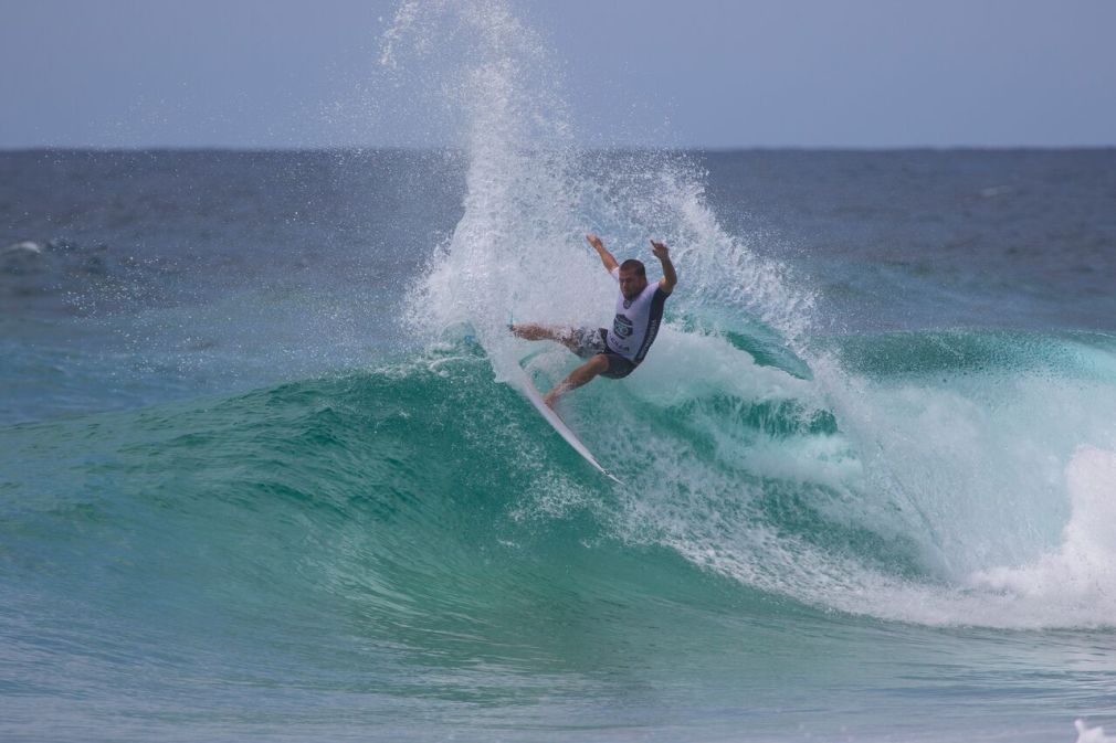 Excited by the potential for decent sections, Mitch Crews (QLD/AUS) forgot to screw in his fins prior to the start of his Round One heat. Despite the fact his fins could have fallen out of his board at any minute, the former Championship Tour (CT) competitor executed a barrage of mammoth turns to post two excellent wave scores in excess of eight-points. This put his fellow competitors into a combination situation (needing two scores) leaving Crews out in front. Crews’ fins finally gave way in the dying moments of the heat, when he lost the middle fin on his final wave of the heat and it was revealed only one side fin was screwed in the whole time.