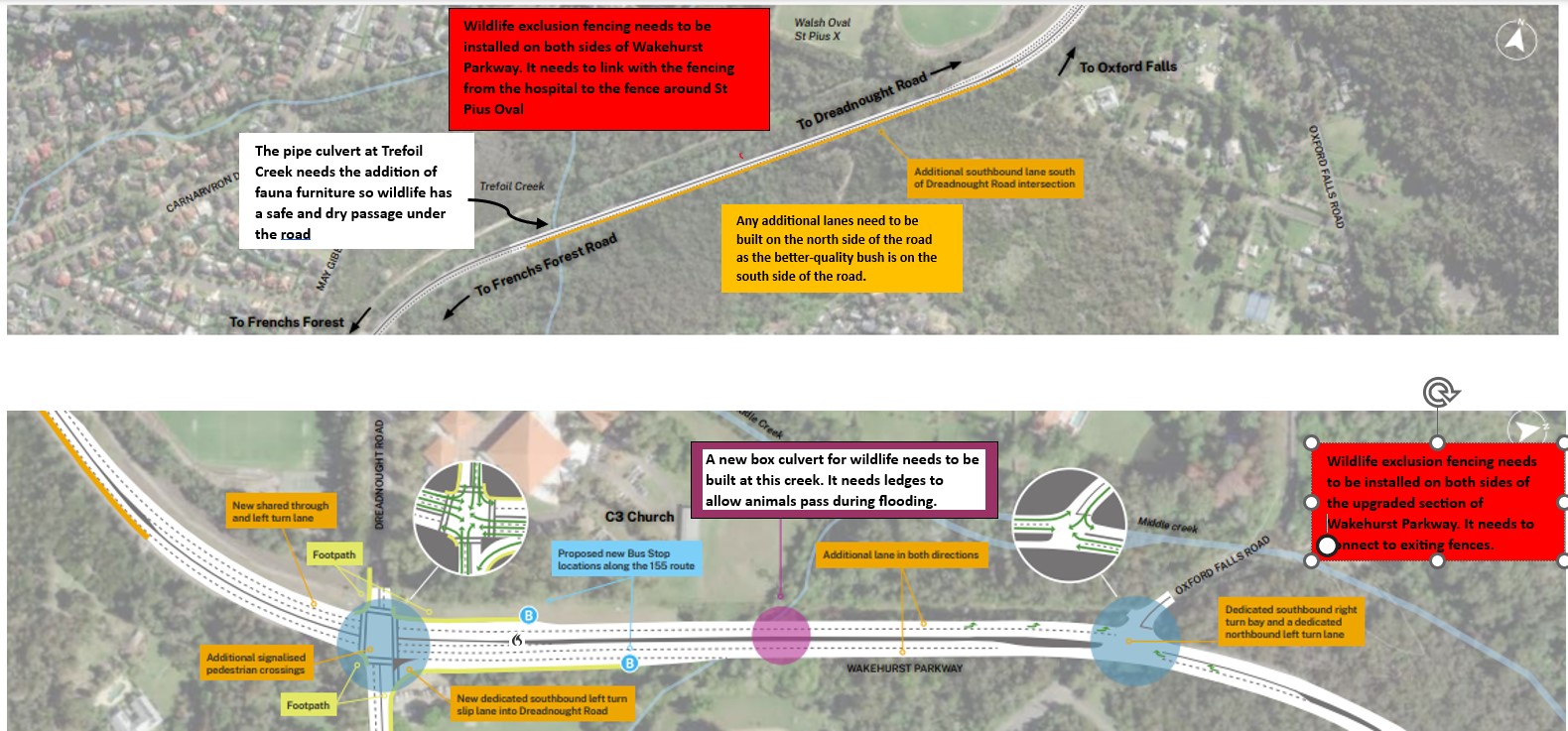 The Parkway has been progressively fenced with animal mitigation fencing. Upgrades provide another opportunity to install more mitigation fencing and to improve underpasses so that animals can move through the area from Garigal National Park in the north to the south side of the Narrabeen Lagoon catchment.