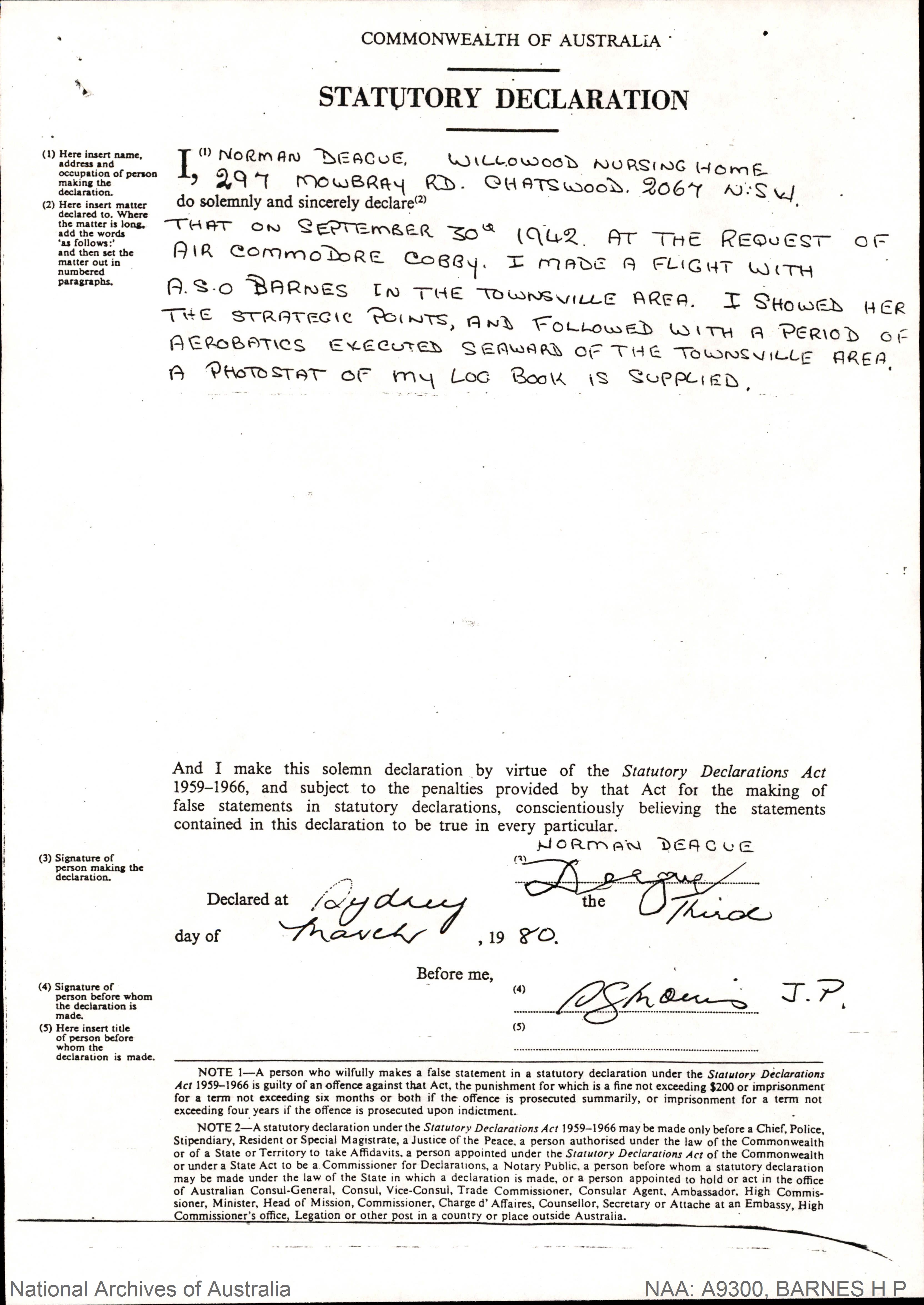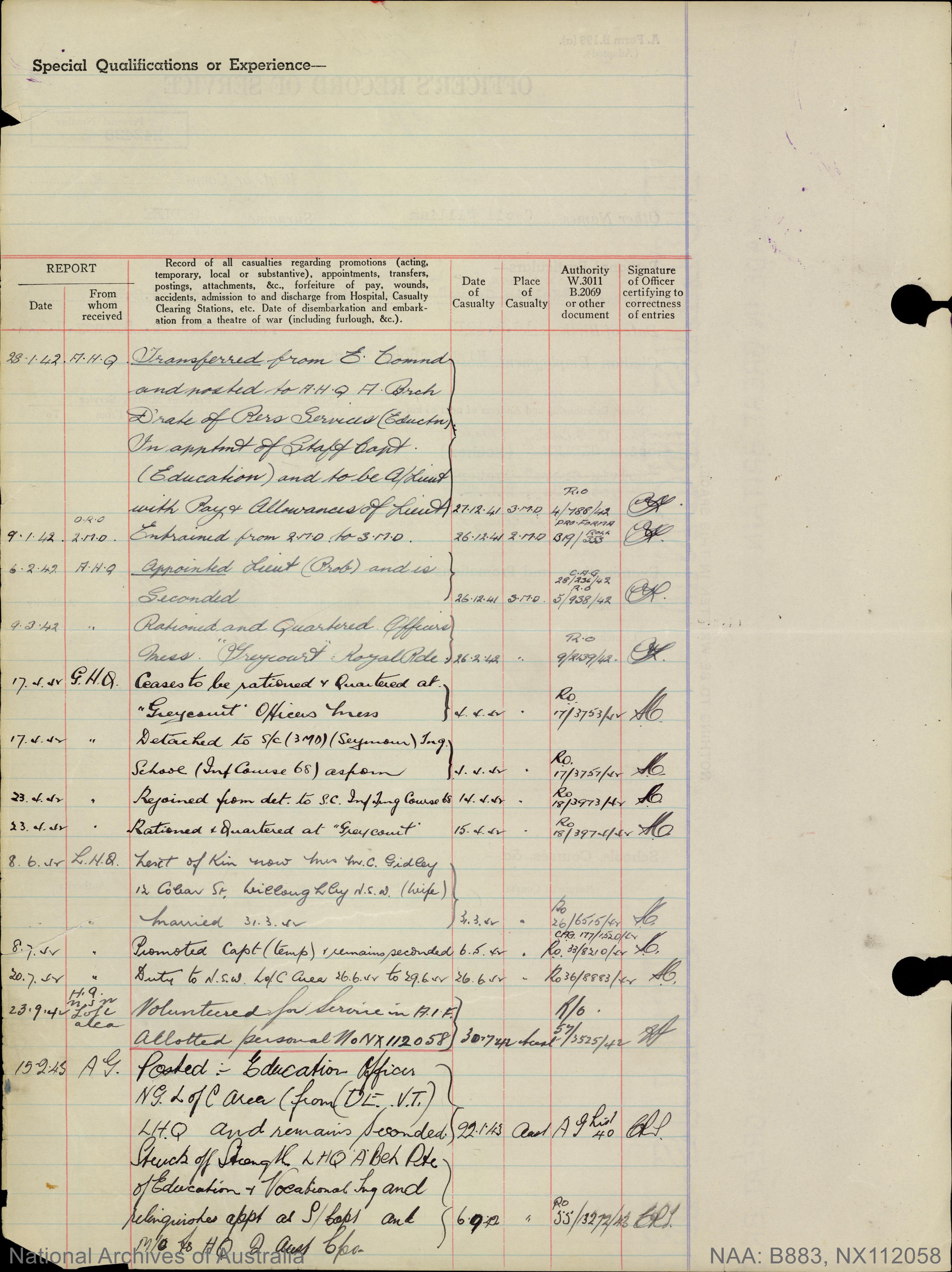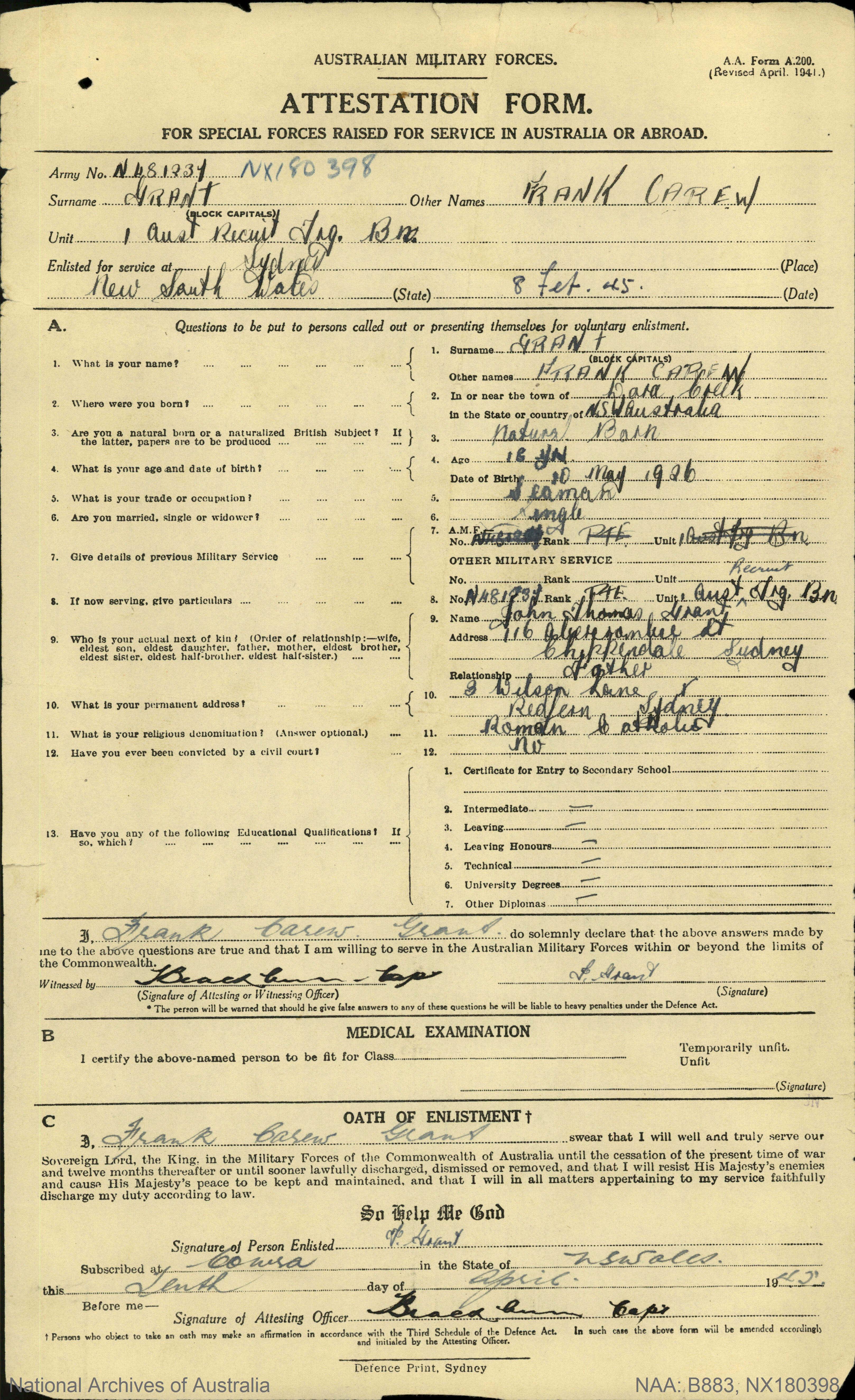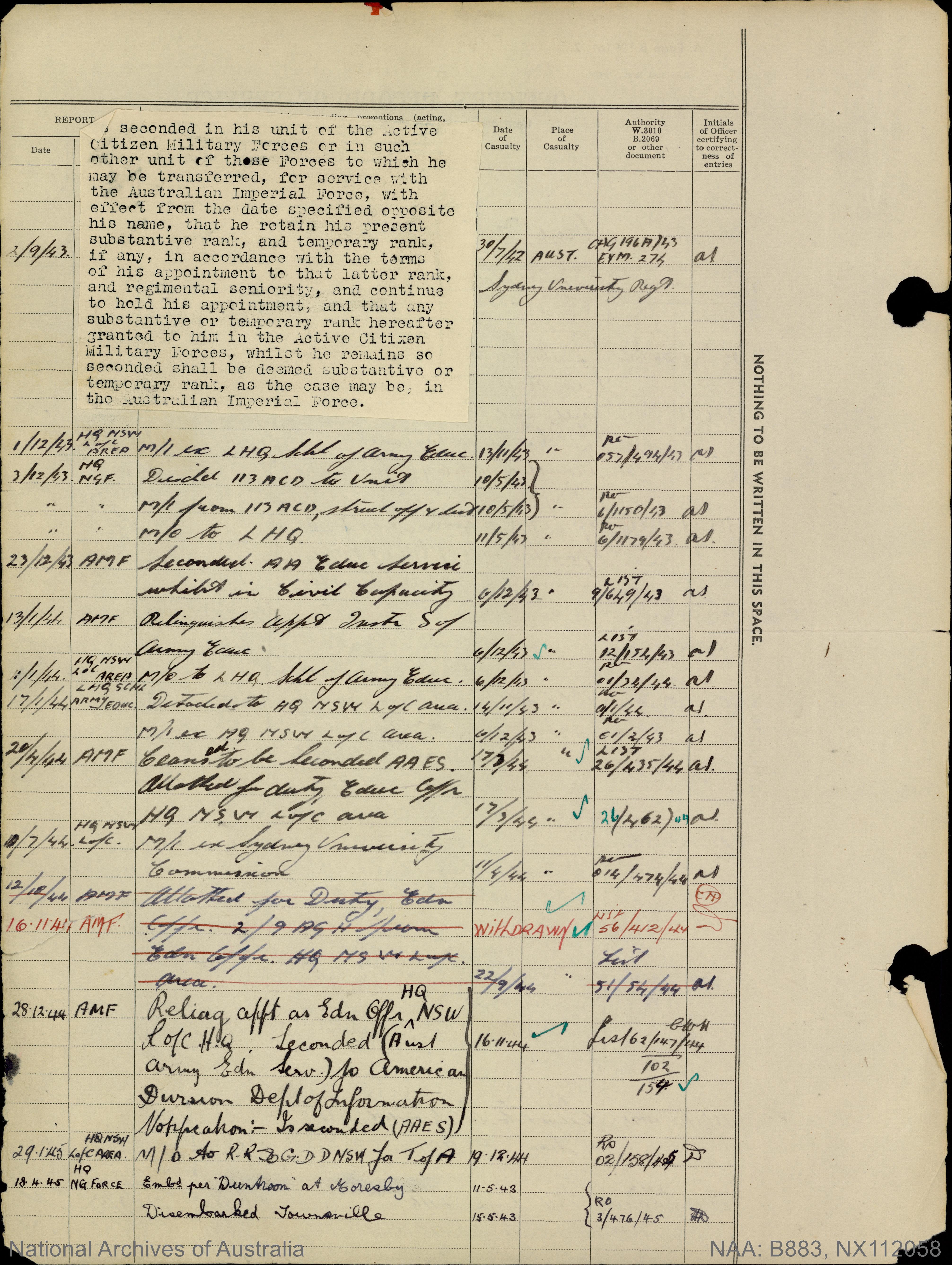 Born May 16, 1912 in Sydney, he had been a High School Teacher prior to enlistment – he had served in the AMF as a private in the infantry from 1929 on. He was aged 30 and married to Maria, and they lived at 12 Cobar Street Willoughby, when enlsiting.
