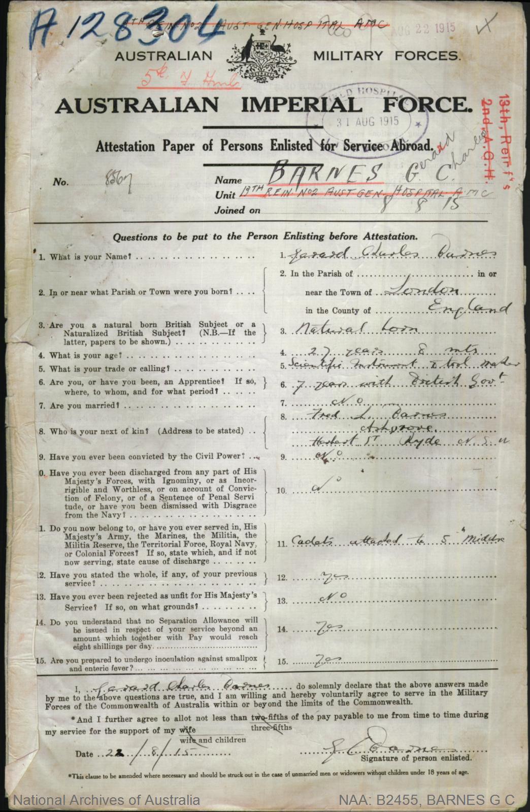 Gerard Barnes WWI enlistment papers - courtesy National Archives of Australia's digitisation of Australian War Records program and project: