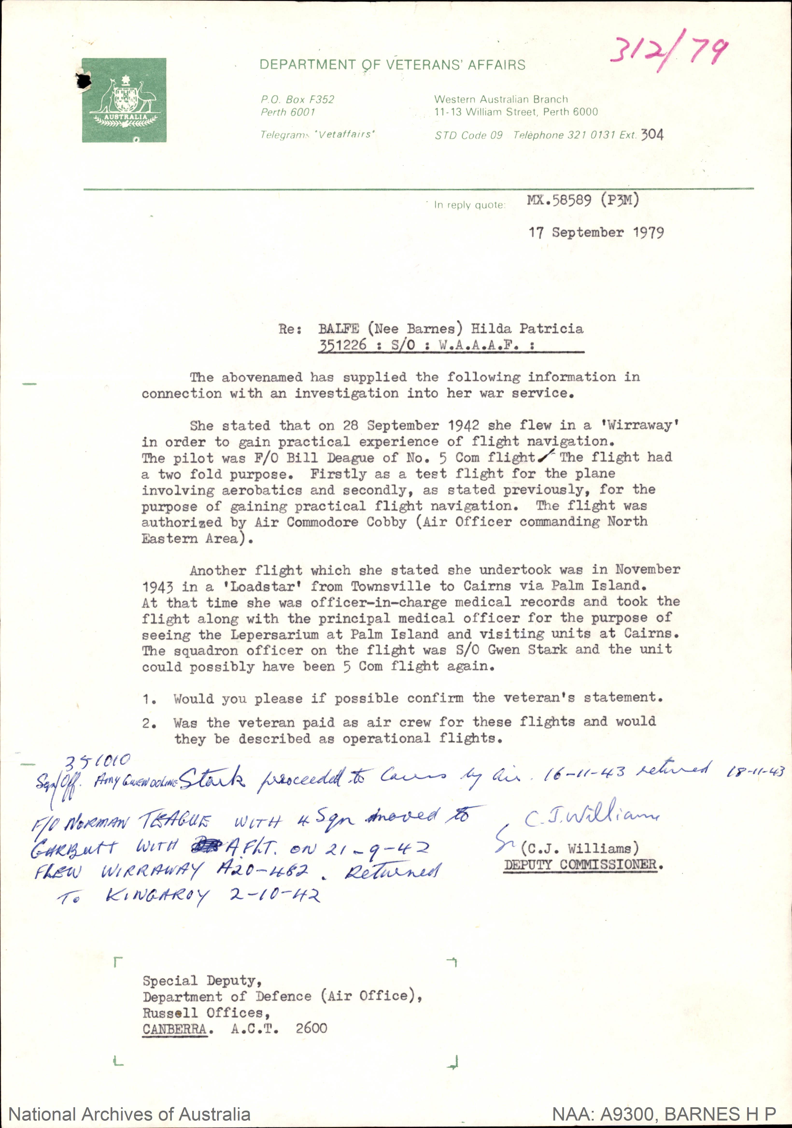 Squadron Officer Stark was assigned to Number 2 Training Group at Wagga, New South Wales on 16 December 1943, where she embarked on a programme of visiting air bases across eastern Australia to check on the welfare of airwomen. On 1 January 1945 she was promoted to Wing Officer, one of only four such officers in the WAAAF. In this capacity and in this position she ended the war.