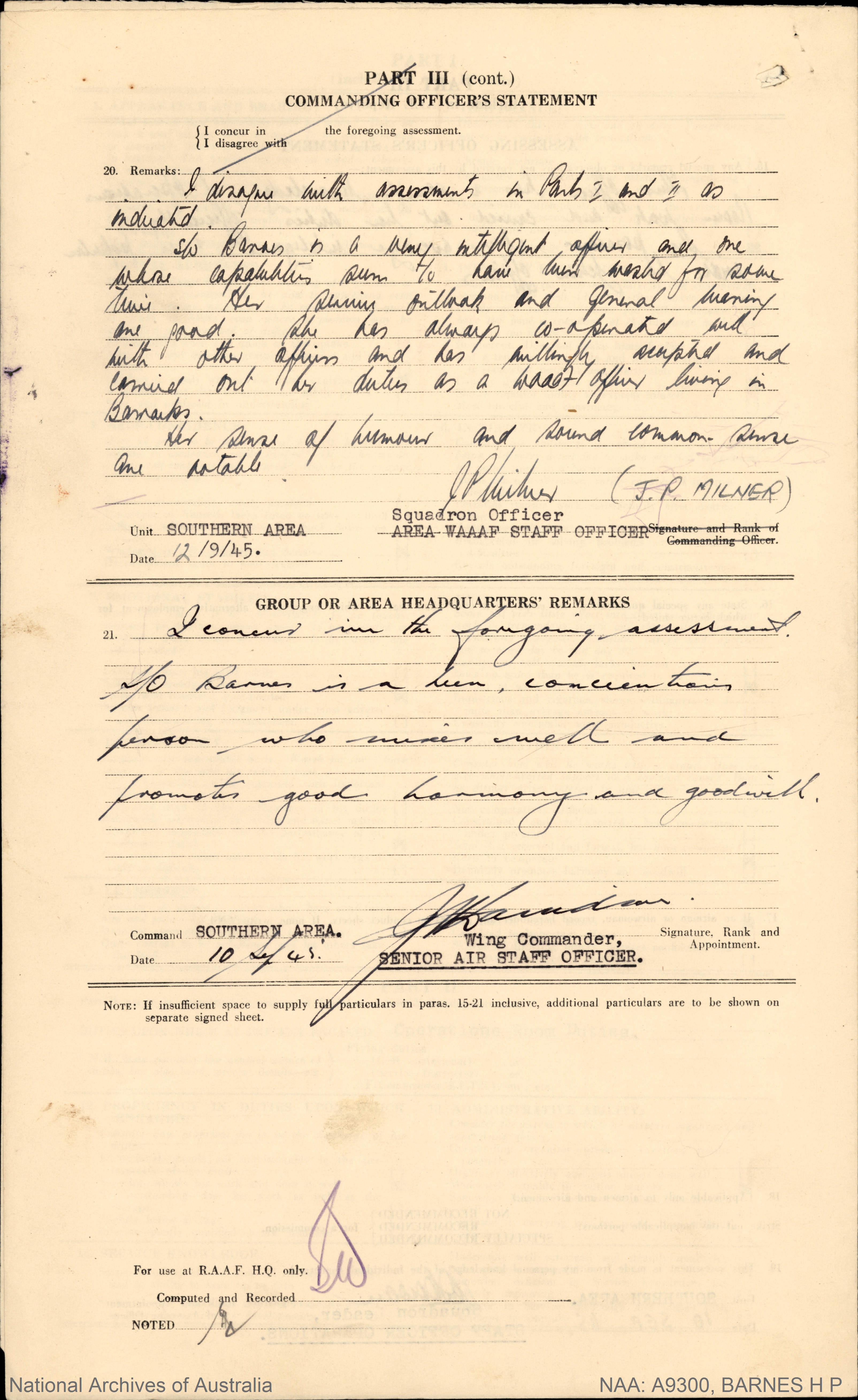 Mr. Barnes is survived by his widow, daughter (formerly Section Officer Patricia Barnes, W.R.A.A.F., now the wife of Squadron Leader J. Balfe, D.F.C.), and son Rupert (ex-A.I.F.). One brother, Harry (Sydney), and two sisters, Nora (Mrs. A. Smith, London), and Doris (Mrs. A. F .Witcombe, Grenfell) also survive the deceased. OBITUARY (1951, November 15). The Grenfell Record and Lachlan District Advertiser (NSW : 1876 - 1951), p. 2. Retrieved from http://nla.gov.au/nla.news-article113426746