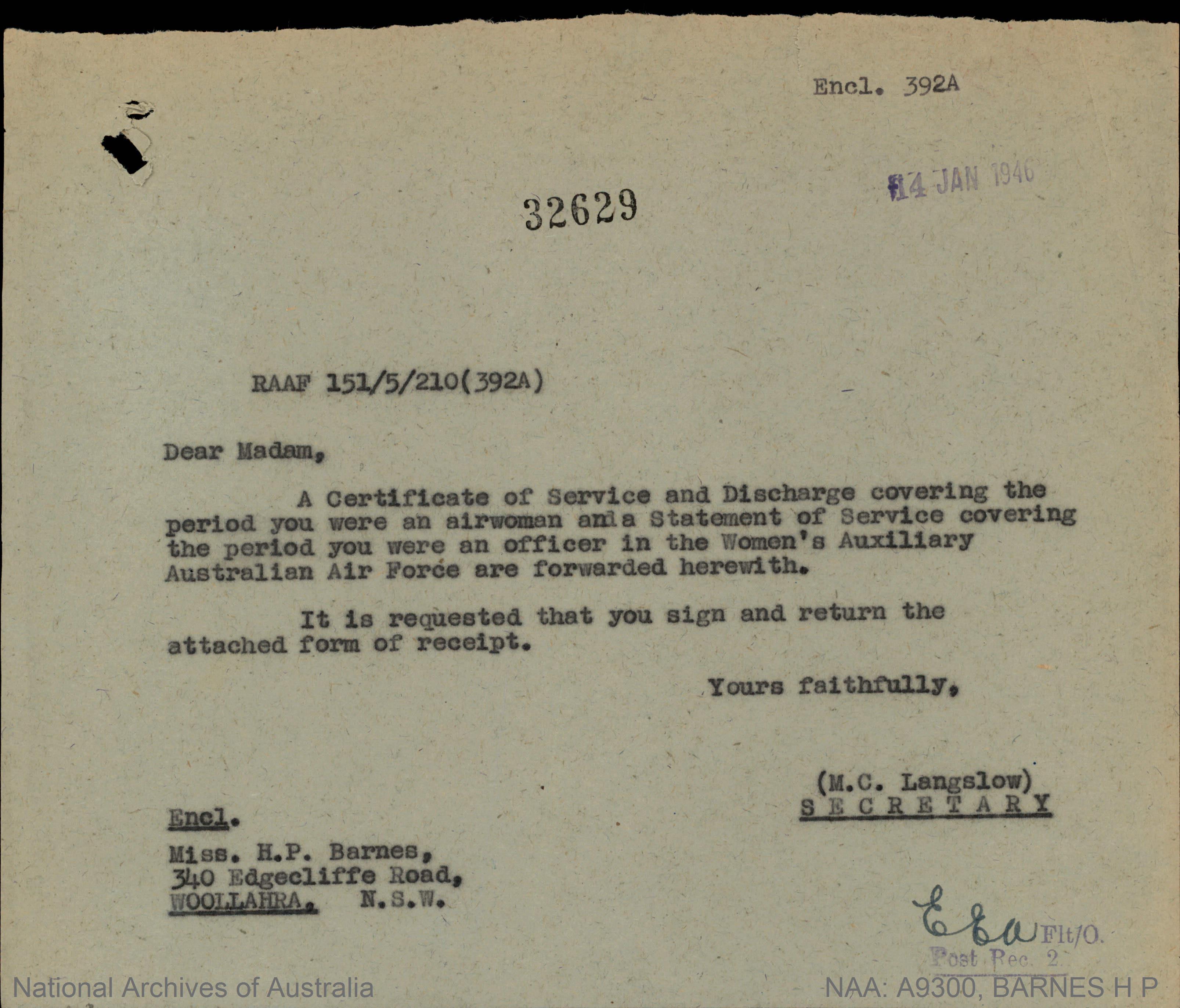 Postwar, she travelled to Europe and worked with the Berlin Air Lift at a Royal Air Force station in Germany for several months. Whilst in England she met her future husband William Caldwell, a retired bank officer; he returned to Australia with her in January 1949 and in July they were married at 23 July at St Philip’s Anglican Church, Sydney.