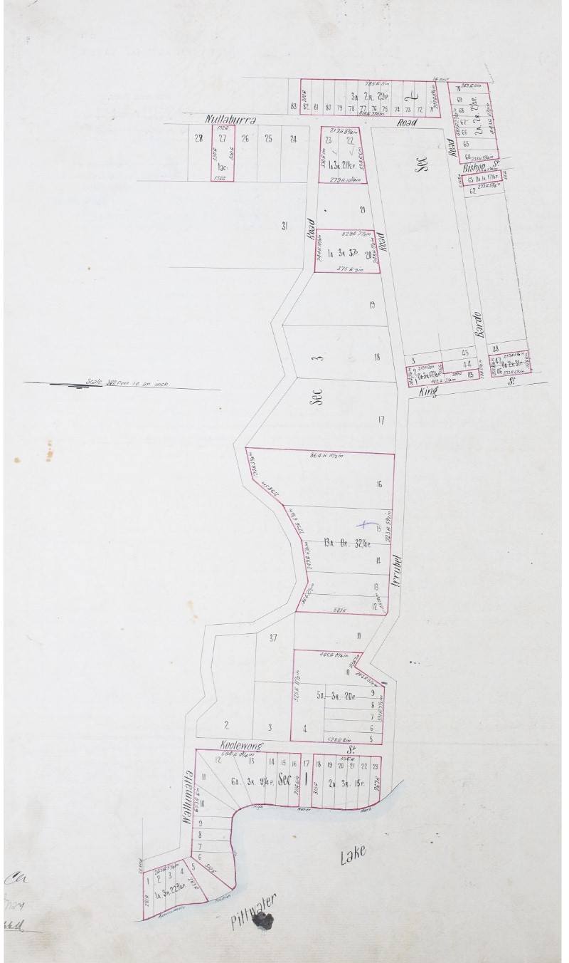 In Vol-Fol 1749-227 is the land at the current day eastern end of Wallumatta, Irrubel and Bardo roads, Newport which was sold off by NSW Realty Company from October 6th 1906 on, on behalf of the Widows Fund Life Assurance Society. These were preceded, including Lots 23 and 22 on corner of Wallamatta and Nullaburra – in Vol-Fol: 1529-162 (Benjamin James 175 acres).