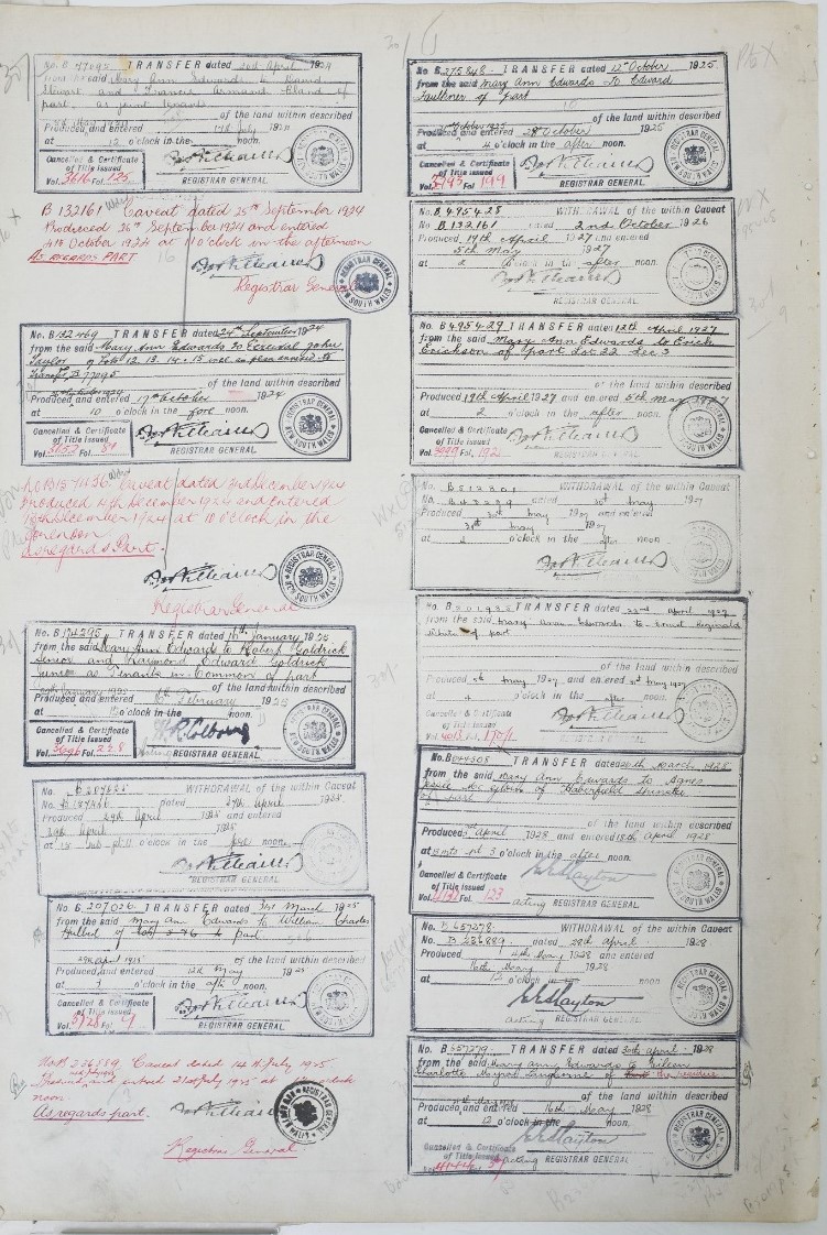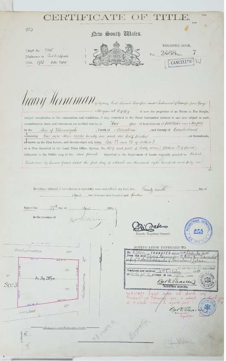 Lots 22 and 23 are sold to Vicary Horniman, Civil Servant, (Vol-Fol 2468-7) with the Certificate of Title registered on April 27th 1914. He sells to Mary Ann Edwards, wife of Robert Edwards of Narrabeen, Labourer, with the exchange recorded on September 27th, 1928: