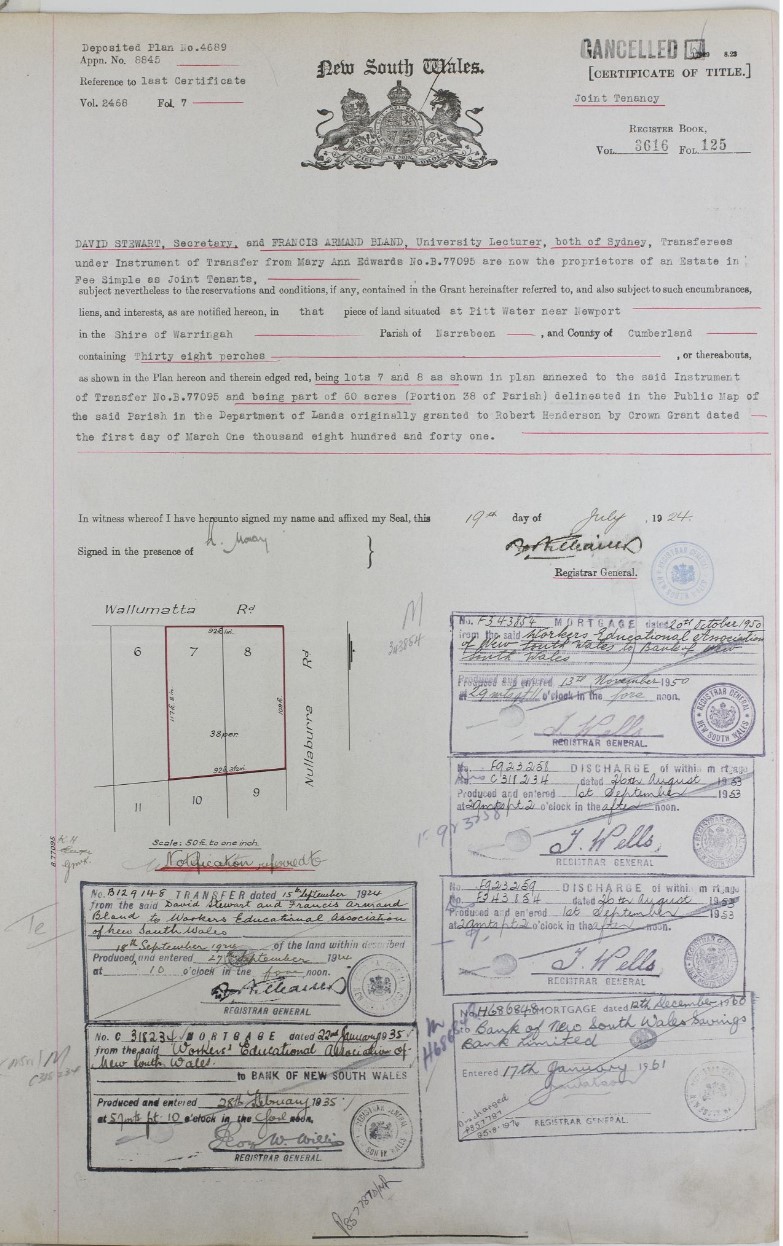 On September 27th 1923 and David Stewart, Secretary, and Francis Armand Bland, University Lecturer, buy part of this (Lots 7 and 8 measuring 38 perches) with the Certificate of Title registered on July 19th 1924; Vol-Fol: 3616-125. They then turn over the same to the WEA on September 15 1924: