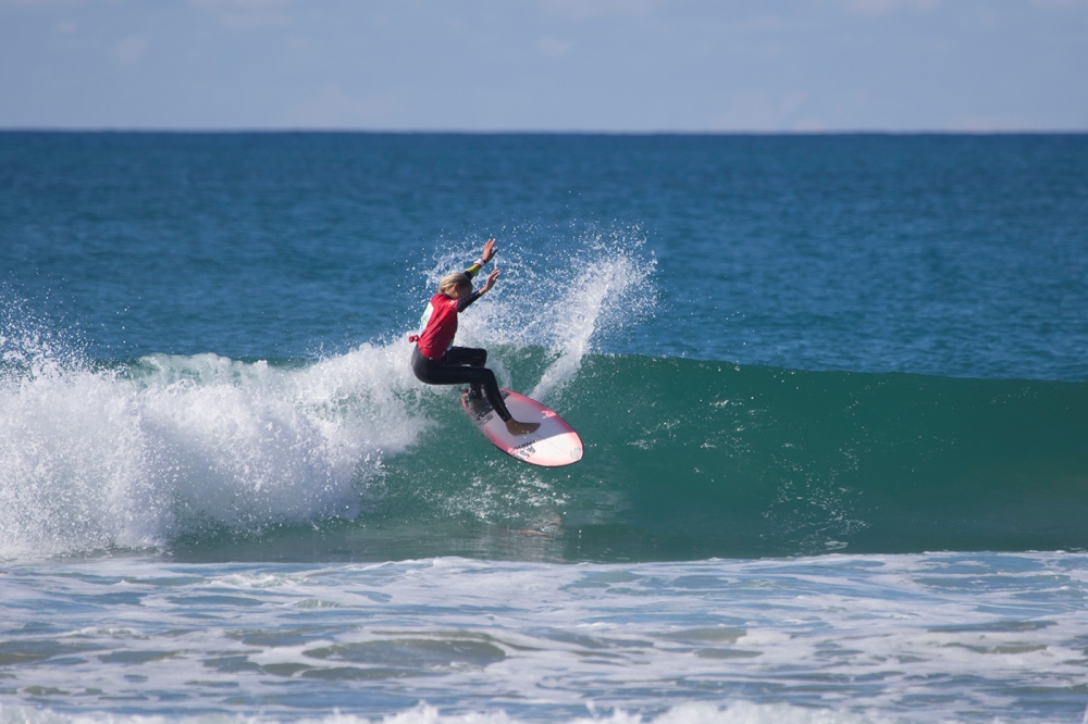 The drop in swell size didn’t hinder north coast natural-footer Nyxie Ryan (Lennox Head) as she proceeded to nail an array of sections that came her way. Ryan performed a handful of textbook power-turns in her opening Under-16 Girls exchange to post a 17.06 two-wave heat total (out of a possible 20 points) and bypass the second chance repechage rounds.