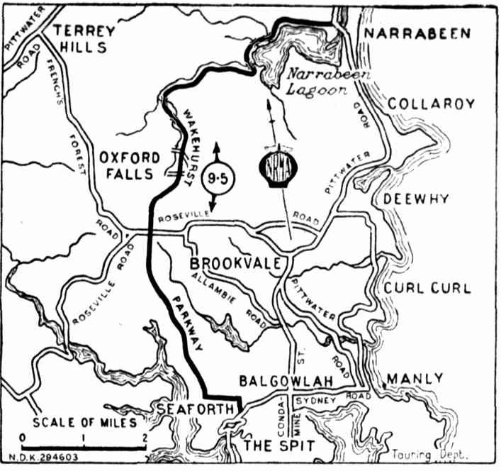 Most maps show the road to Oxford Falls as continuing on across the creek to Join the French's Forest-road. This is not the case; the road continues for about half a mile beyond the falls, and then peters out, advises the N.R.M.A. Returning from the falls to the turn-off by the same road, the motorist keens straight ahead to the top of Beacon Hill, leading down to Brookvale. From the top of the hill there are magnificent panorama of beaches and splendid distant views of the coast. Descending the steep hill, the road to the right is taken and the tram line followed Into Manly. From Manly, the Sydney-road is taken, and a return to the city made by way of The Spit Bridge. If the motorist wishes to extend the trip, to Lake in more of the northern beaches, he should keep straight on at the foot of Beacon Hill, and follow the concrete road from the Brookvale Showground to Narrabeen. A tarred surface is passed over beyond Narrabeen to Palm Beach.